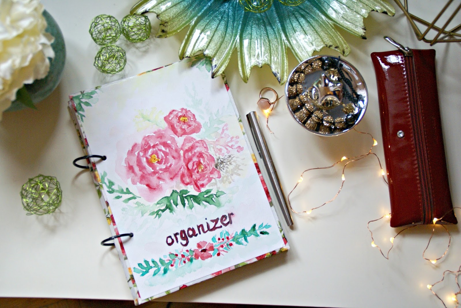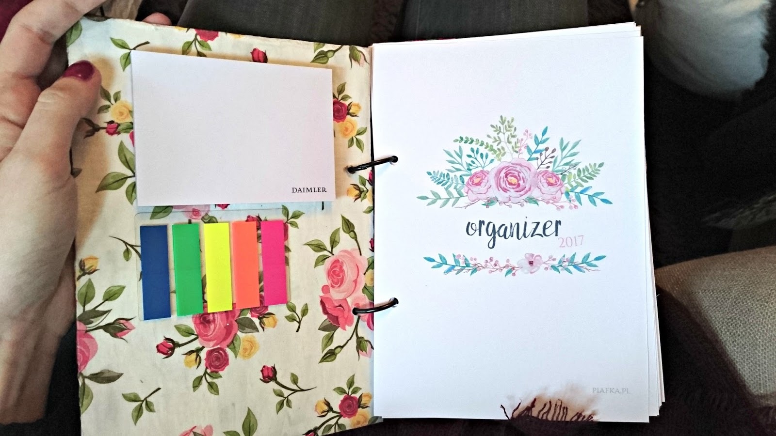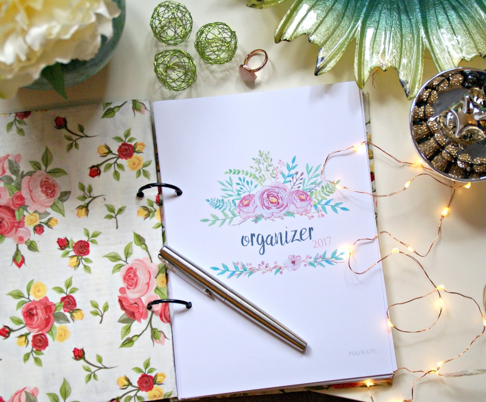 Całość spięłam takimi kółkami, które kupiłam na allegro, ale równie dobrze można użyć np. wąskiej wstążki. Co do kolejności organizera to ułożyłam to sobie tak: spis treści, plany i cele, wszystkie listy (książki, filmy, miejsca do zwiedzenia itd.), do zrobienia, notatki, blog i wszystko do niego no i na koniec kalendarz. Pominęłam strony z oszczędzaniem bo tego już kiedyś próbowałam i i tak nigdy nie udawało mi się uzupełniać na bieżąco 😛 Muszę jeszcze obejrzeć planery dzienne i tygodniowe oraz planer postów 🙂