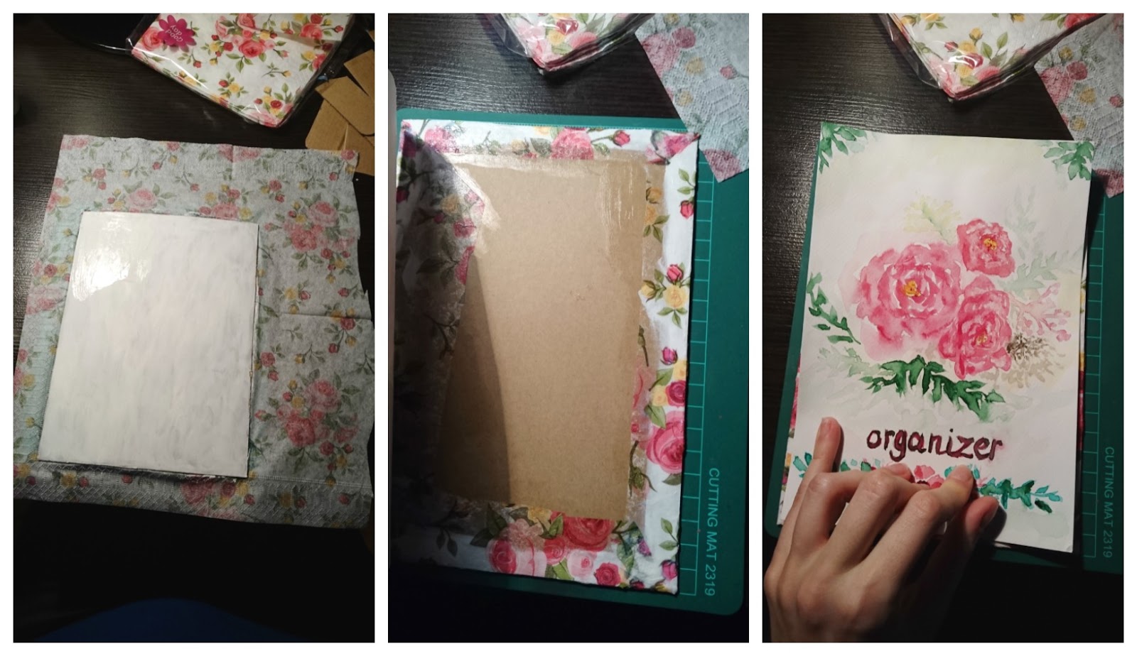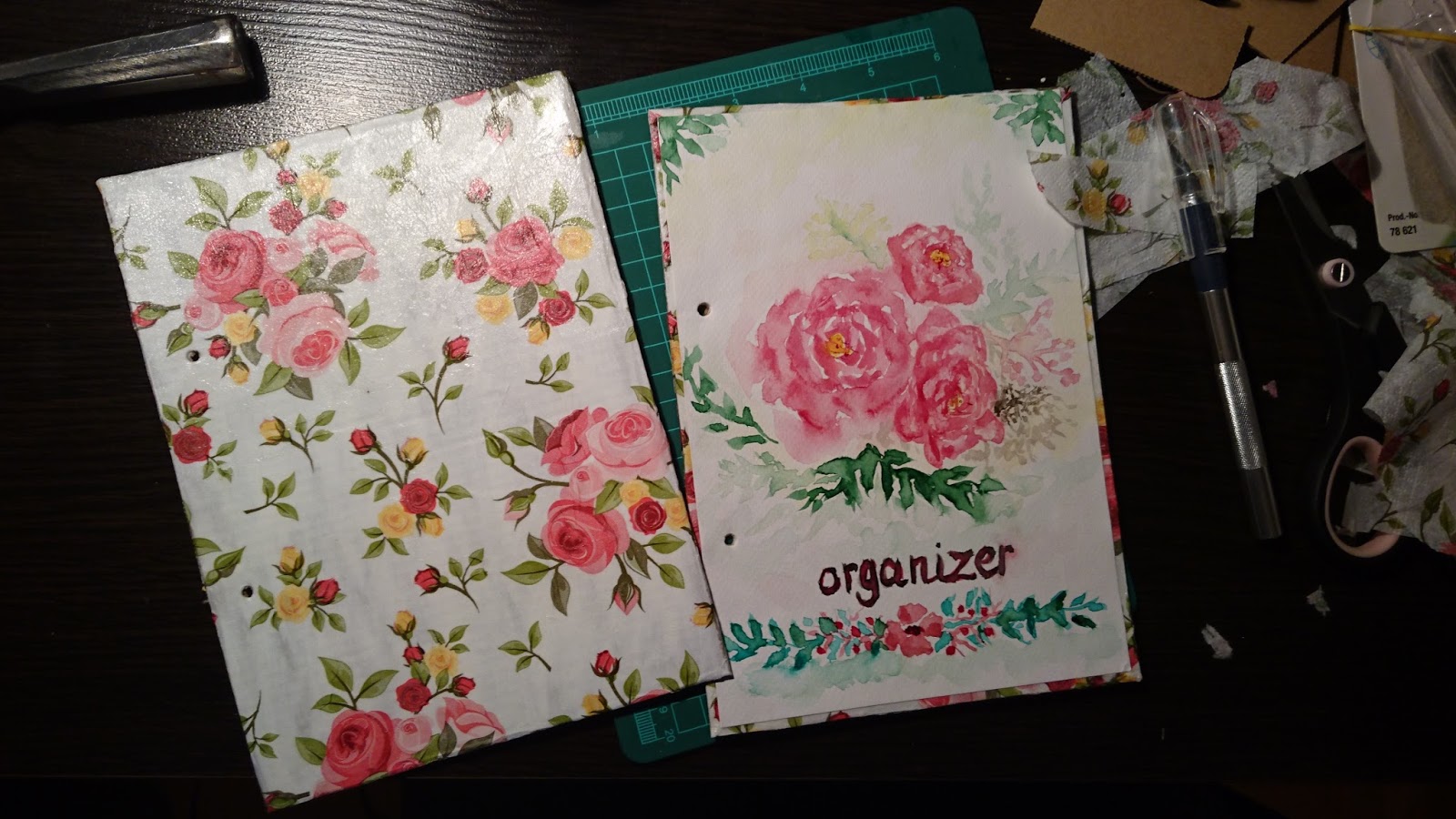 Następnie tekturę malowałam z obu stron na biało, żeby ten tekturowy brąz nie przebijał przez chusteczkowe decoupage. Na okładce z przodu (tam gdzie chciałam nakleić mój 'malunek’) pomalowałam tylko brzegi, które będą widoczne, resztę zostawiłam. Po wyschnięciu posmarowałam jedną stronę, nakleiłam na nią chusteczkę w różyczki po czym pokryłam jeszcze jedną warstwą na wierzchu chusteczki. To samo zrobiłam z resztą (chusteczki zaginałam na drugą stronę, żeby brzegi tektury nie były widoczne). Na koniec nakleiłam moje malowane róże na jednej z tekturek klejem do decoupage.