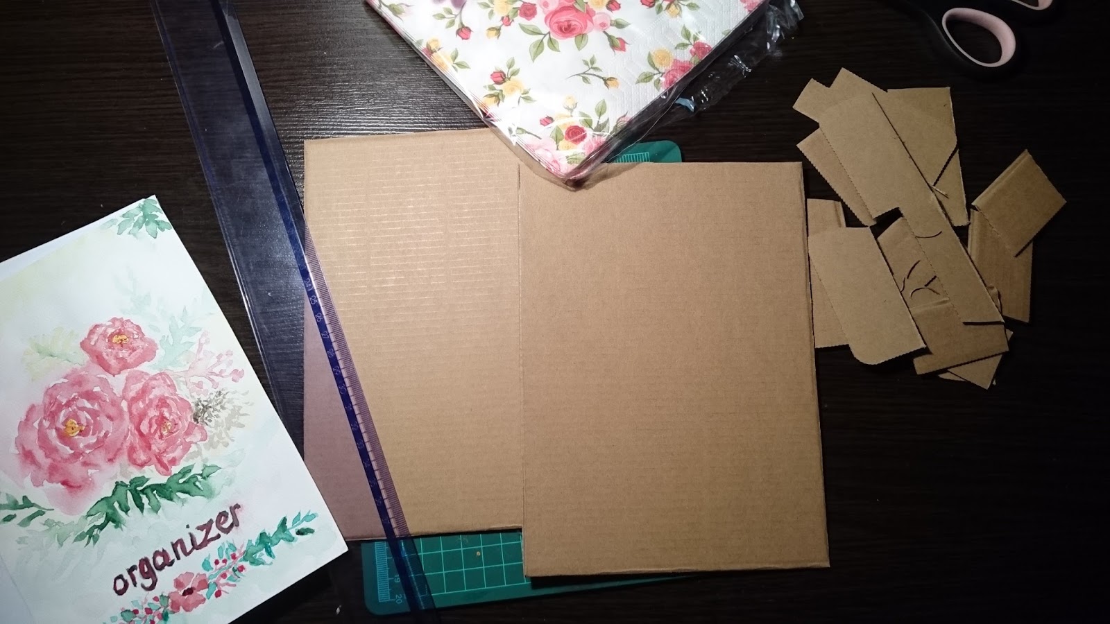 Namalowałam na papierze do akwareli kilka różyczek i kwiatków 🙂 (ale równie dobrze można też coś ładnego znaleźć w internecie i wydrukować). Później skombinowałam odpowiedniej wielkości tekturę, którą docięłam, żeby wszystko ładnie pasowało (tylko żeby to nie była tektura falista bo niestety kiepsko by wyglądała)