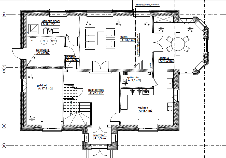 Jeśli chodzi o środek, to niewiele zmienia się w porównaniu z poprzednią wersją – jest korytarz do kotłowni i łazienki na dole i małe przesunięcie ściany gabinetu.