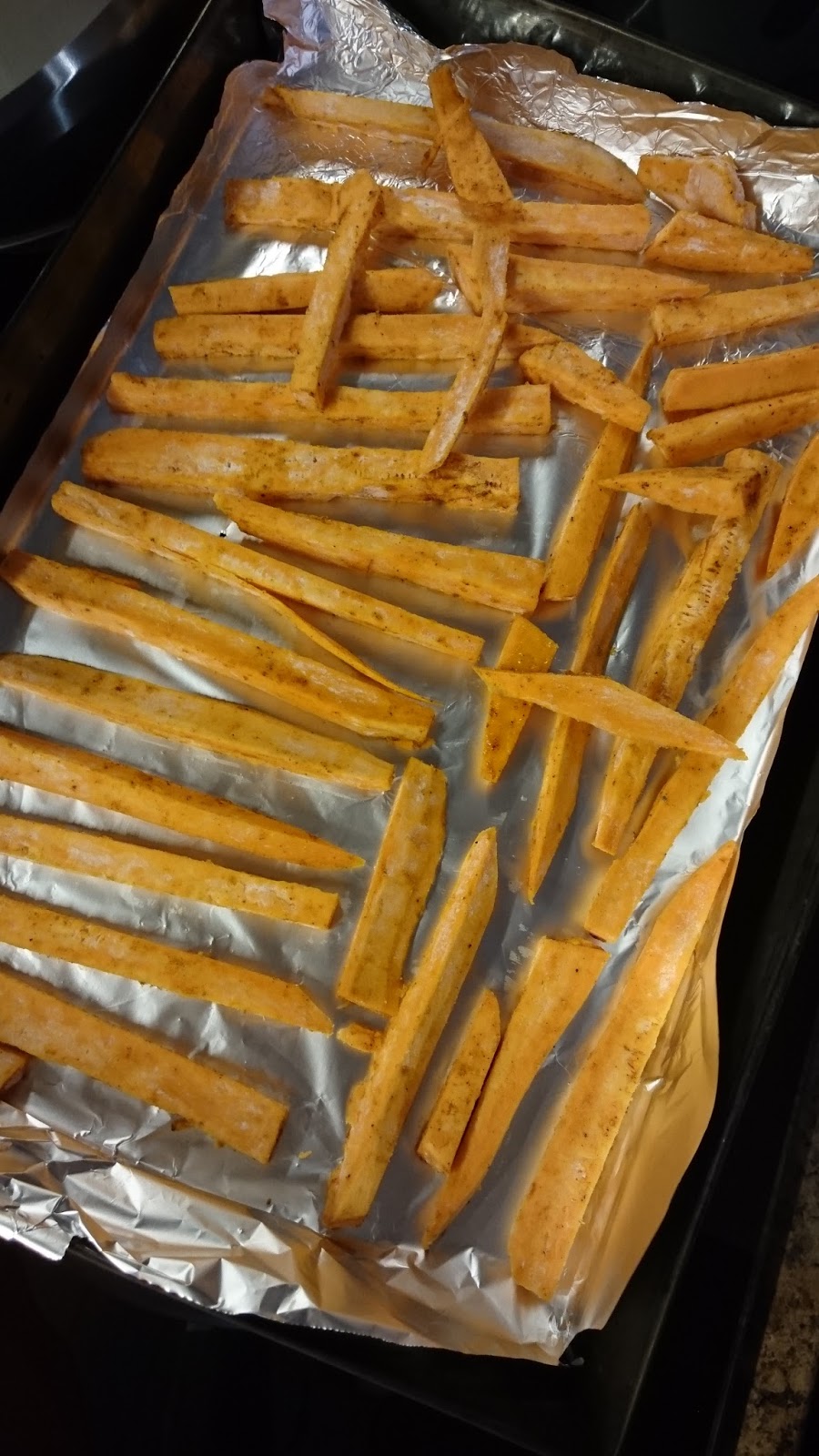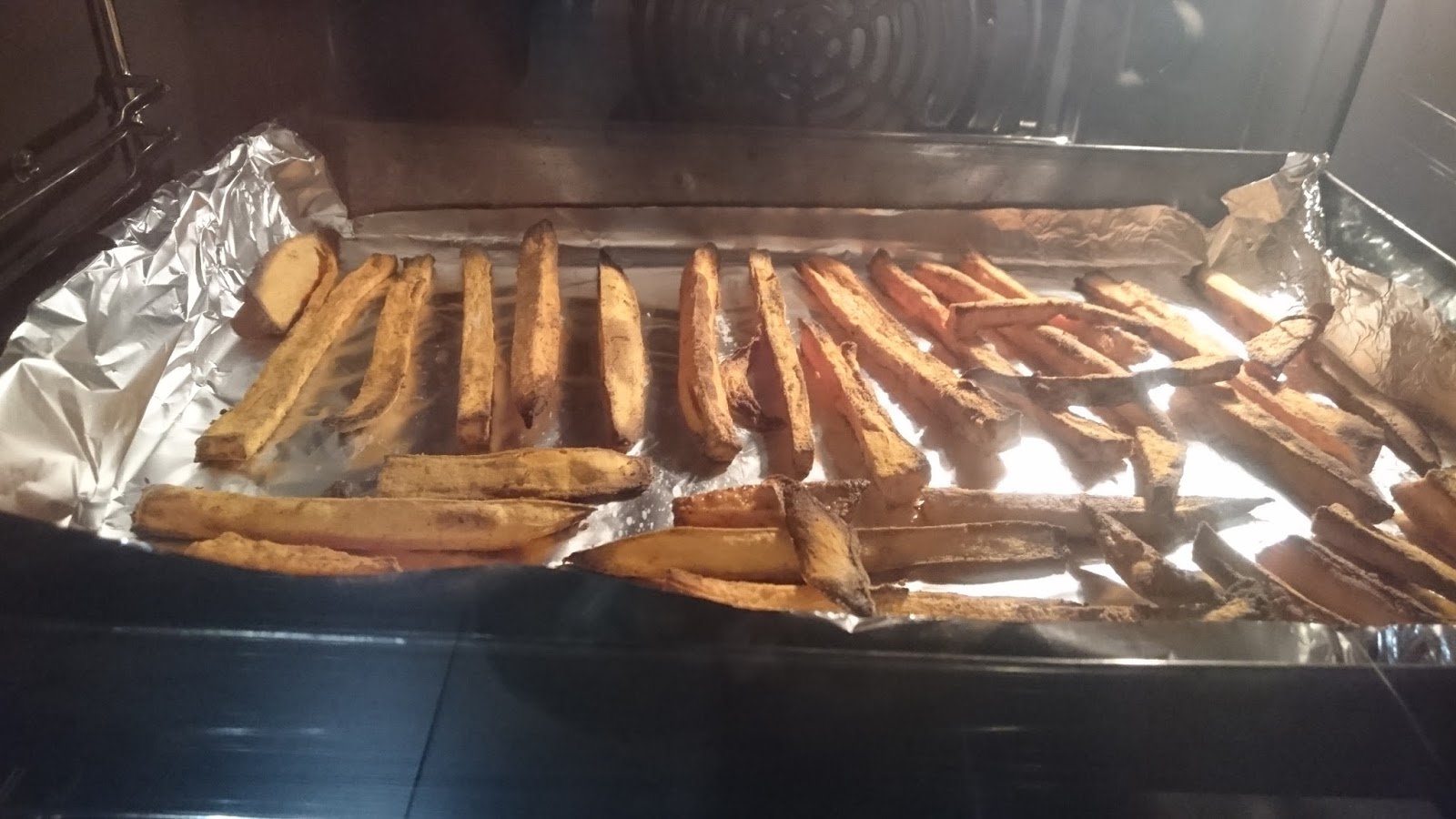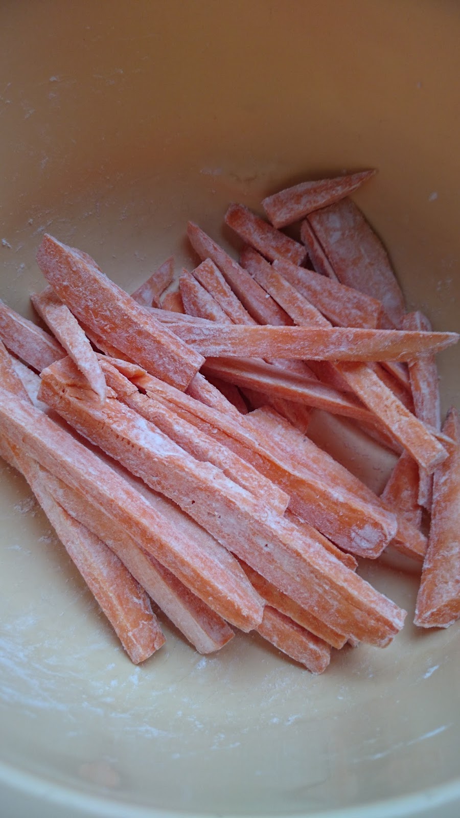 Frytki uwielbiam, nie wiem czy wiecie, ale kiedyś potrafiłam robić sobie frytki nawet trzy razy w tygodniu (robić w sensie 'wrzucać gotowe do piekarnika’;) Ale, że od dłuższego czasu ich unikam i jem bardzo rzadko (średnio się po nich czuję) to pomyślałam, że wypróbuję coś innego – jakiś czas temu zaszalałam i zrobiłam frytki z batatów. Tak długo już sobie te zdjęcia leżały, że już chyba pora najwyższa na nie:) Bo w sumie to trochę się rozmiłowałam w takich frytkach, są szybkie do zrobienia, pyszne i do tego najwyraźniej lekkostrawne bo jednak nie ma tego nieprzyjemnego ciążenia w żołądku jak po zwykłych frytkach. Ostatnio przygotowałam je dosłownie w 10minut (+oczywiście 20min w piekarniku).