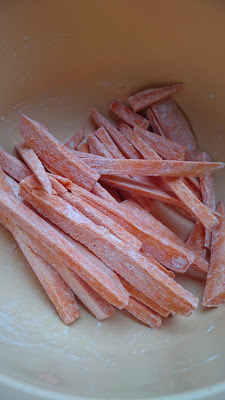 • obtocz frytki w skrobi kukurydzianej (nada chrupkości, podpatrzone na amerykańskich blogach:P),