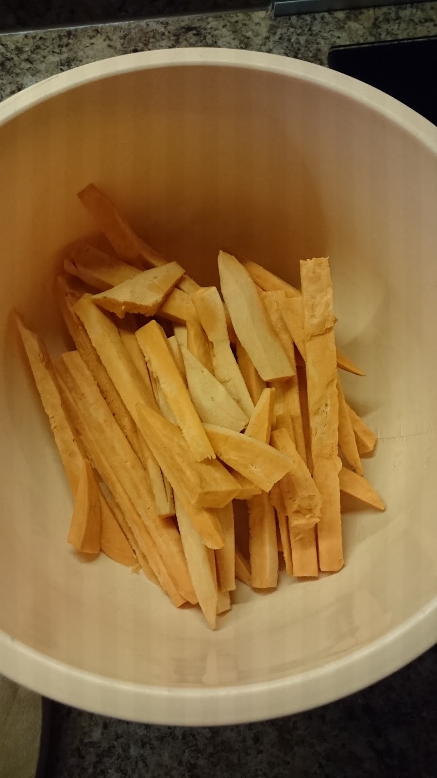 • umyj bataty, obierz ze skóry i pokrój w równe paski,