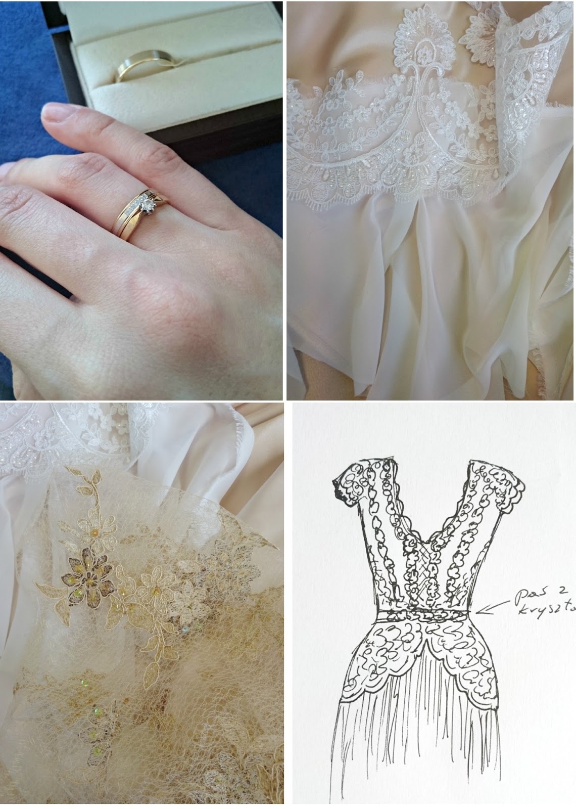 Obrączki już odebrane, a suknia się szyje – muszę powiedzieć, że chyba jestem trochę upierdliwa bo ciągle wysyłam krawcowej jakieś swoje pytania, pomysły i… szkic ułożenia koronek, ale co zrobić 😛 Mam nadzieję, że będę zadowolona 😉