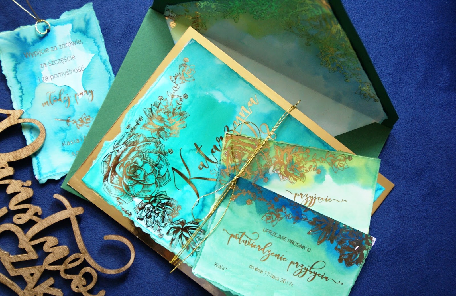 Jestem po prostu zachwycona tymi zaproszeniami 🙂 Naczekałam się na nie trochę, ale są ręcznie robione, więc się tego spodziewałam 🙂 Jeśli z zaproszeniami Wam się nie śpieszy to bardzo, bardzo polecam te od dekoris, na żywo wyglądają jeszcze lepiej 😀 Do tego mamy zawieszki na alkohole i ozdobny napis na tort, a że spóźnili się z wysyłką o tydzień to dostaliśmy jeszcze gratis duże pudełko na telegramy z tym samym wzorem co zaproszenia 🙂