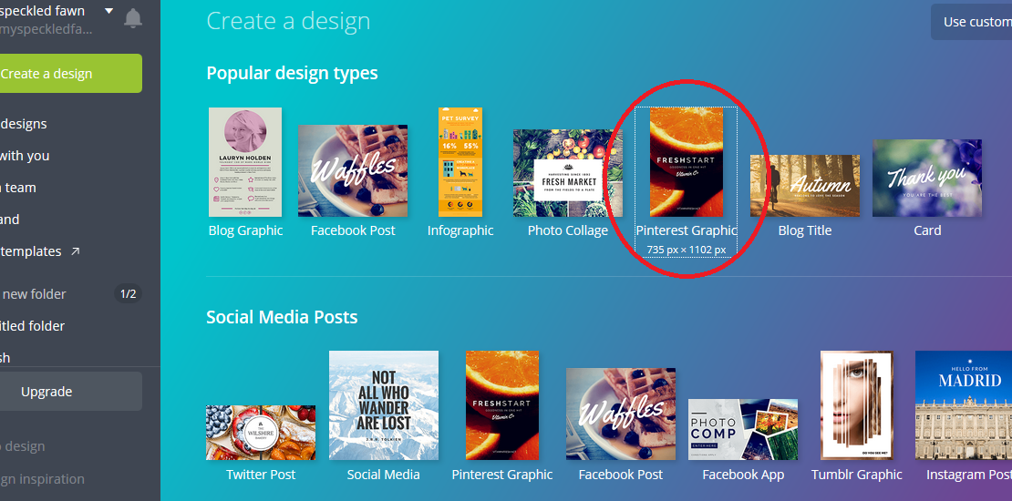 - po lewej stronie kliknij 'create a design’ i wybierz jeden z możliwych projektów np. rozmiar 'pinterest’:
