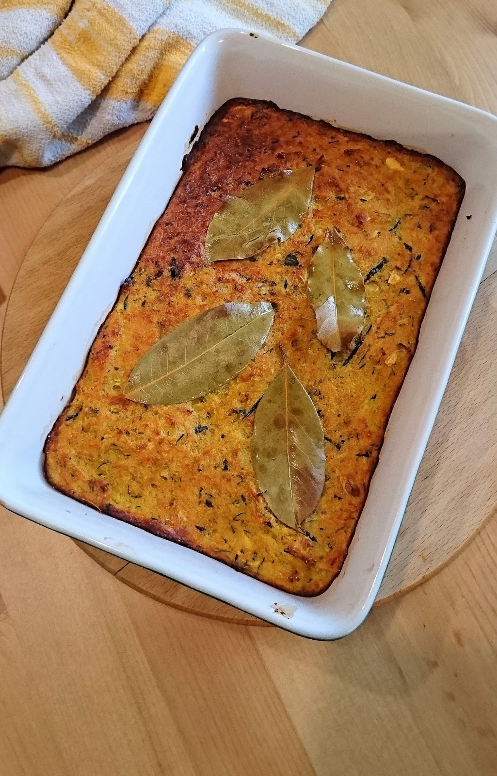 • wszystko dokładnie wymieszaj i przełóż do foremki wysmarowanej masłem lub olejem do pieczenia,