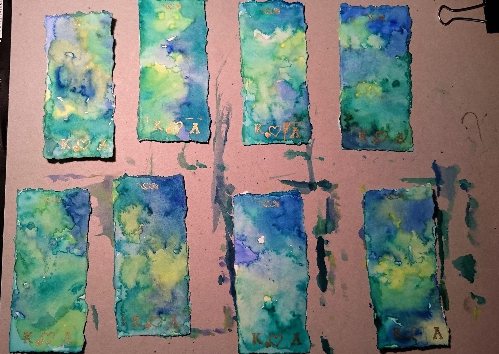 Aniołki standardowo przyszły przymocowane do brązowych tekturek, stwierdziłam, że nie do końca mi to pasuje i namalowałam sobie samodzielnie karteczki pasujące do naszych zaproszeń i pudełka na telegramy 🙂 Złotymi pieczątkami dodałam jeszcze nasze inicjały na dole, podobnie jak robiłam na zaproszeniach.