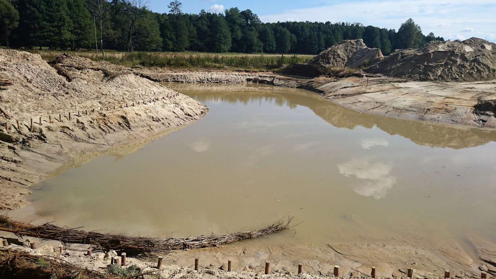Praca trwała dwa dni – najpierw wypompowano wodę do pobliskich bagienek, później koparka pogłębiła staw do ok.2,5m, a w międzyczasie panowie faszynowi wbijali kołki dookoła stawu. Dzisiaj pracę dokończyli układając wiązki sosny, przykrywając agrowłókniną i przysypując ziemią od strony skarpy. Całość prezentuje się teraz nie najgorzej, ale to jak wyglądają brzegi jest lekko tragiczne 😉 W najbliższym tygodniu koparka ma je ładnie wyrównać, a kiedy już wszystko trochę osiądzie zacznę się bawić z roślinkami wszelakimi 😀