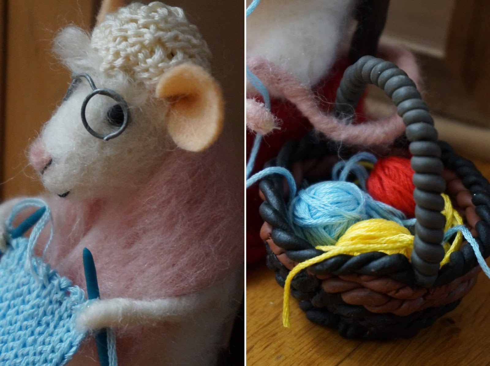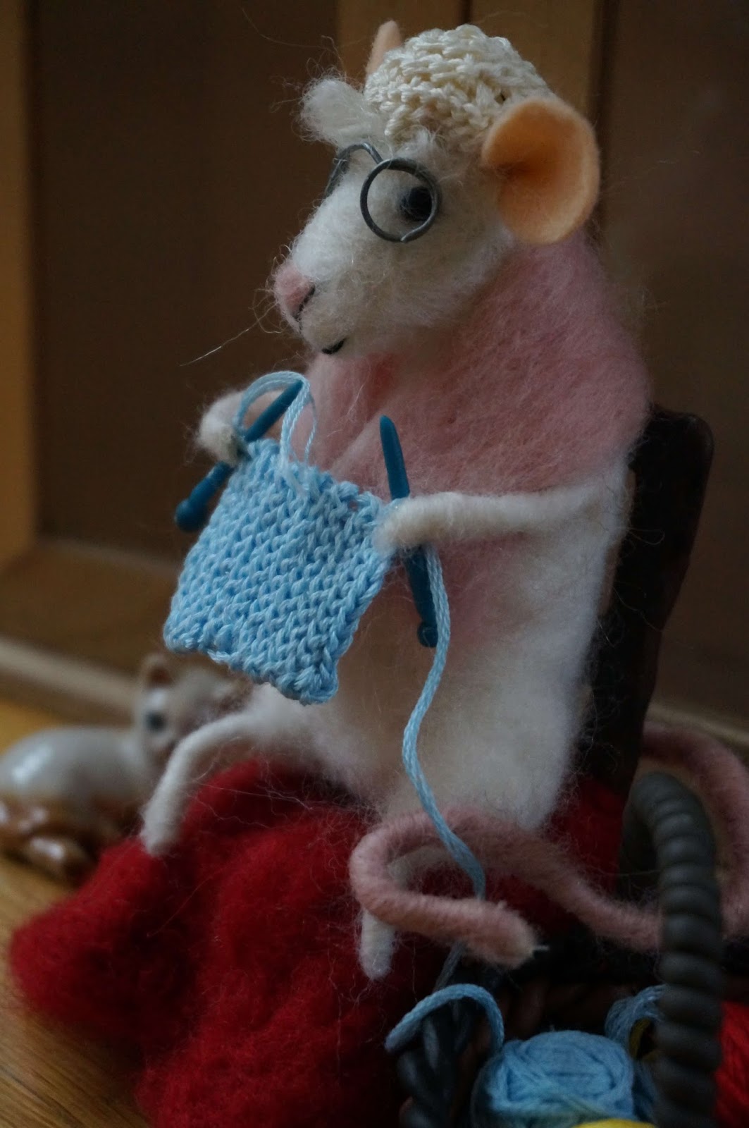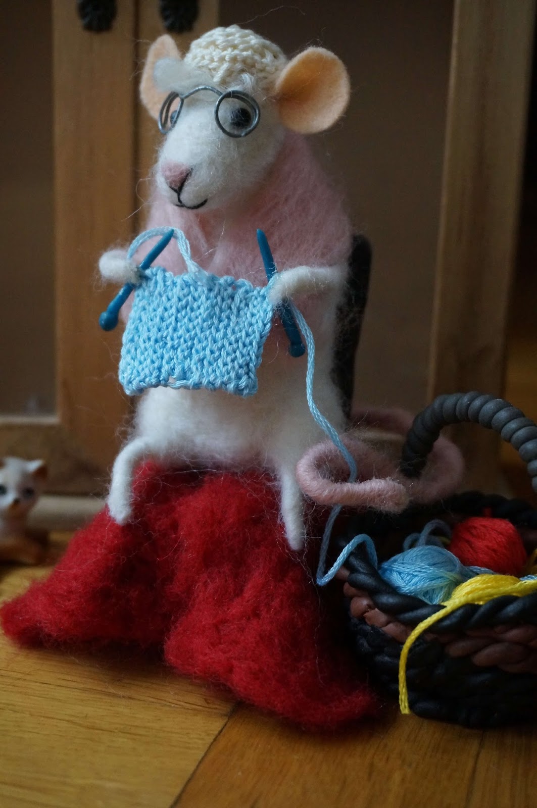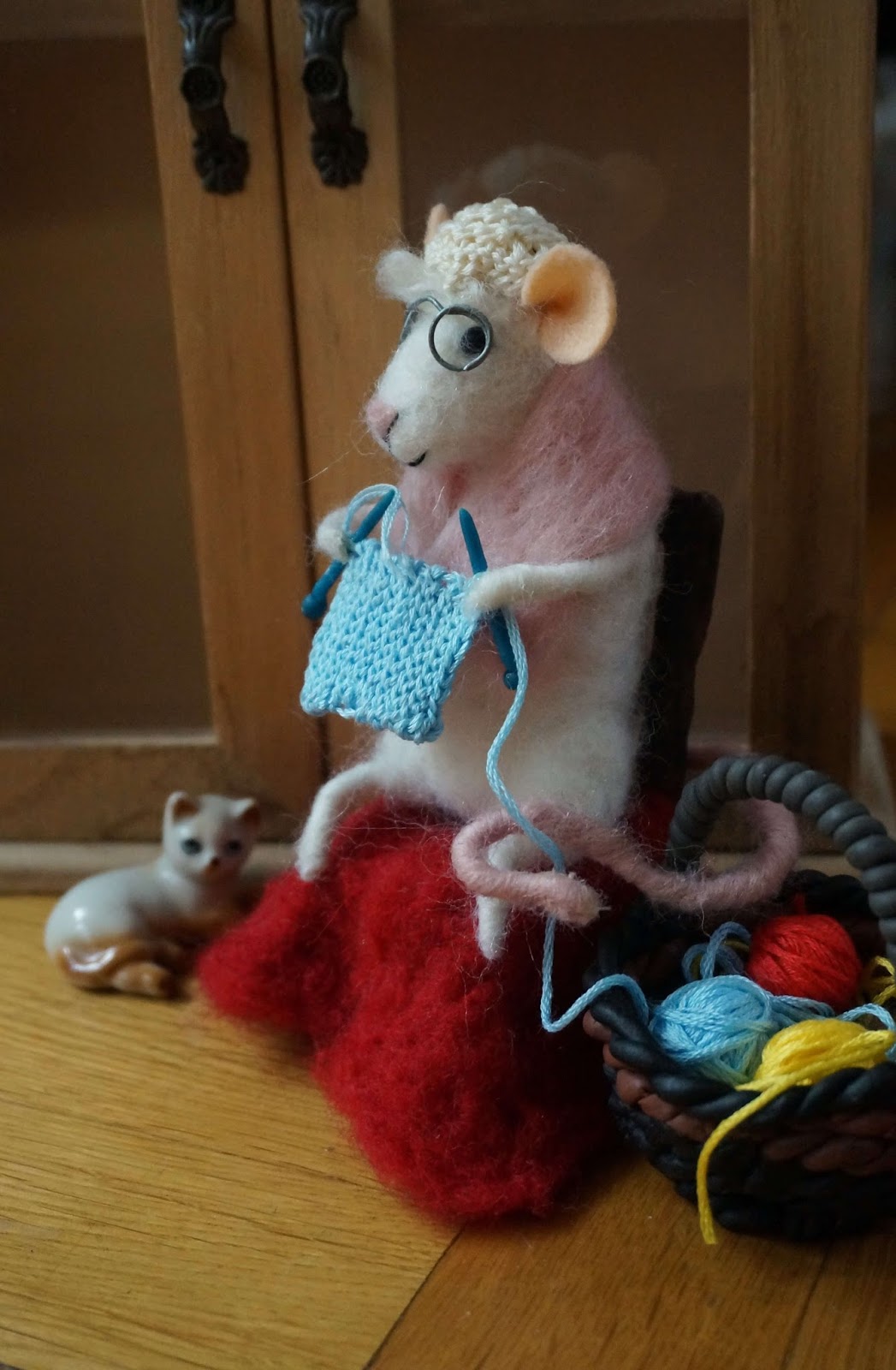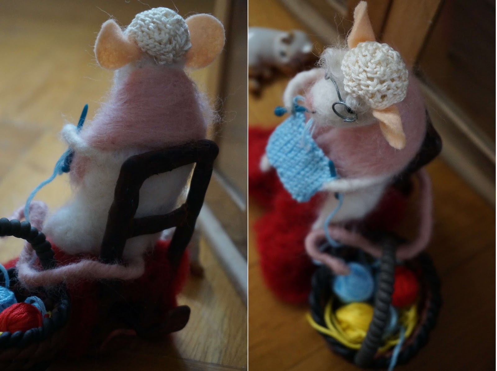 Dużo pracy mnie ta mycha kosztowała 🙂 Dużo w niej było szczegółów do zrobienia poza filcowaniem, od modelinowego krzesła, koszyka i drutów, po szydełkowy czepek i robótkę 🙂 No i okulary, trochę się przy nich nakombinowałam, żeby były równe, chyba je jeszcze pomaluję na złoto 😀 To co myślicie o pani Myszy? :))