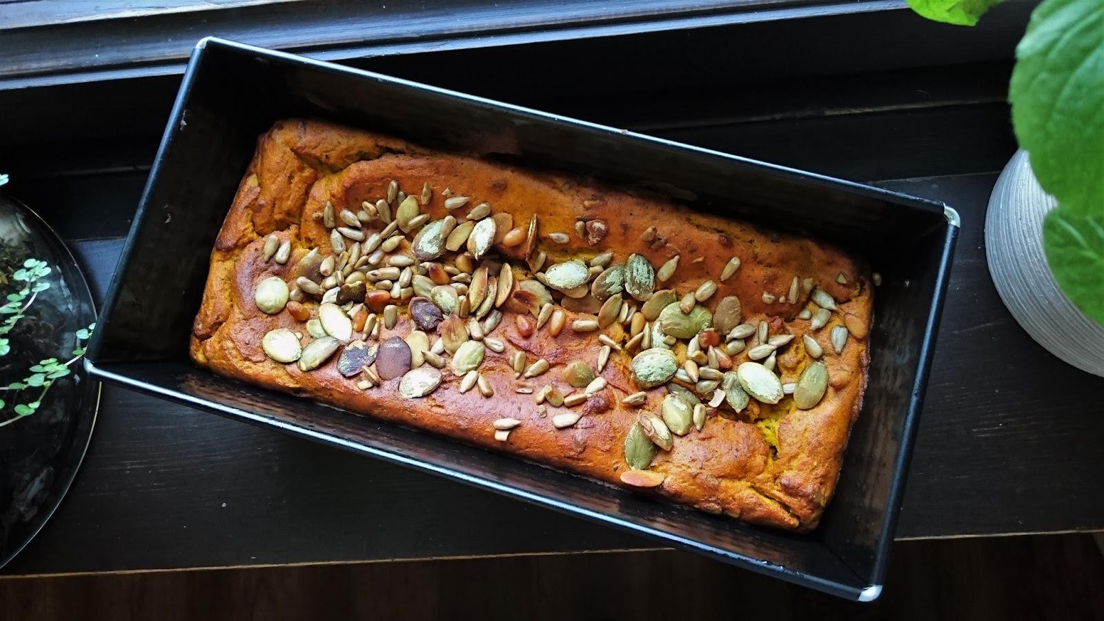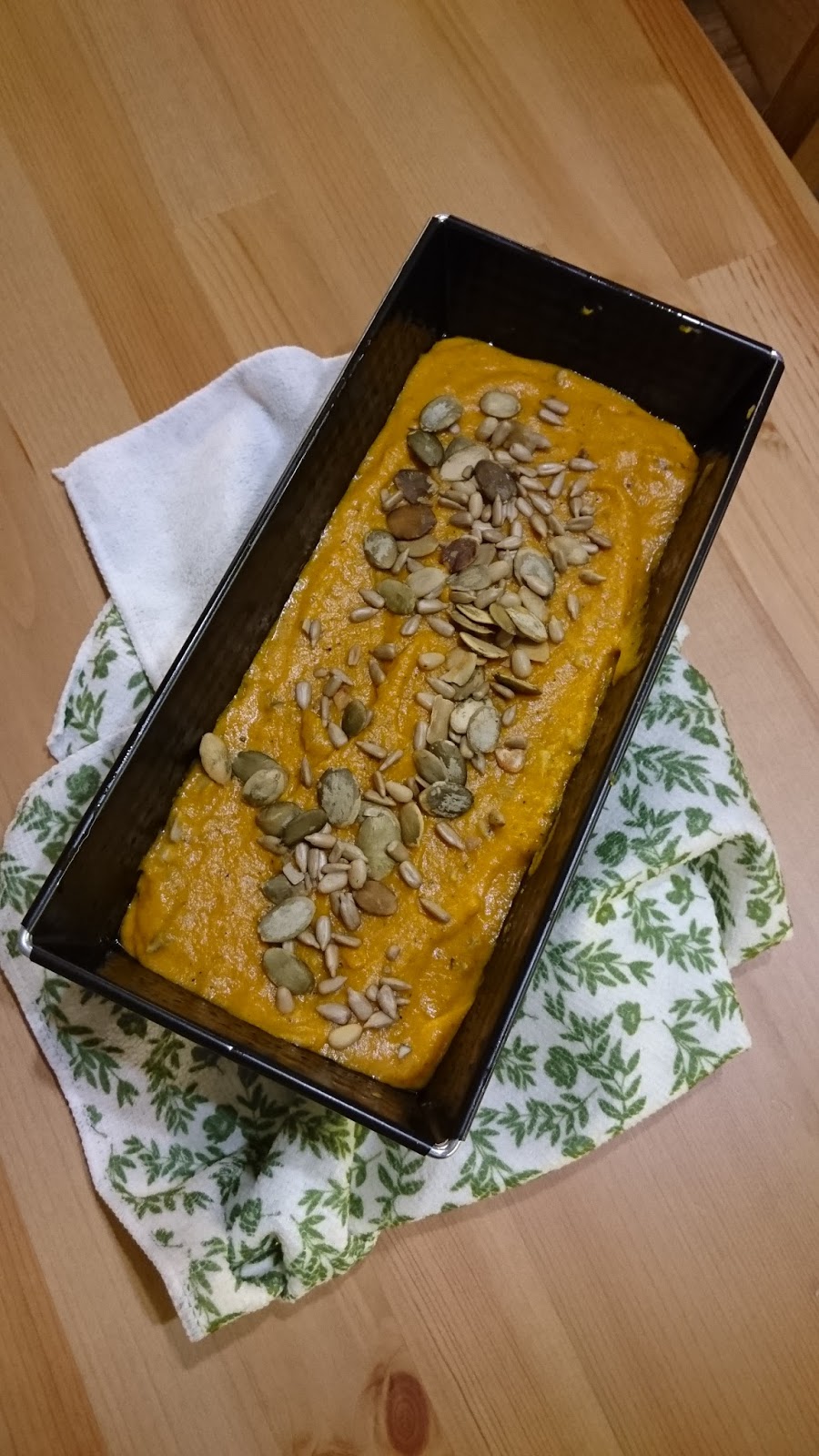 • do ciasta wrzuć pestki dyni i słonecznika, wszystko dokładnie wymieszaj i przełóż do foremki wysmarowanej masłem lub olejem do pieczenia,