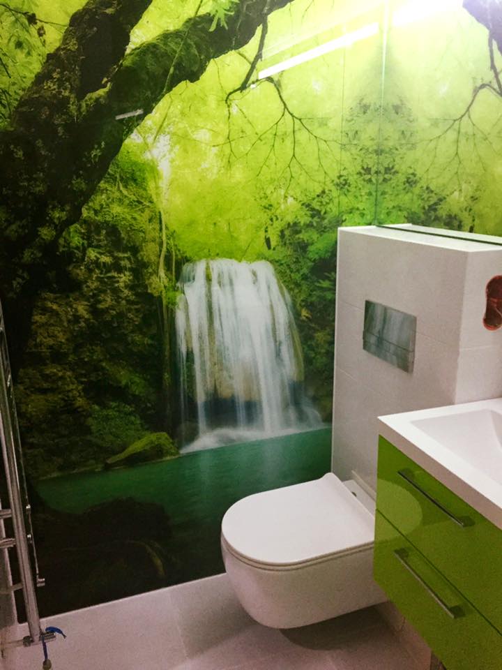 Kto powiedział, że fototapeta nie może być położona w łazience? Nie wiem, w każdym razie ten ktoś grubo się mylił 😉 Udało mi się znaleźć dwie udane łazienki z fototapetami 🙂  Ta powyżej, w kolorach świeżej, soczystej zieleni, dzięki widokowi na tropikalne lasy staje się bardzo oryginalna i bardziej przestrzenna:)