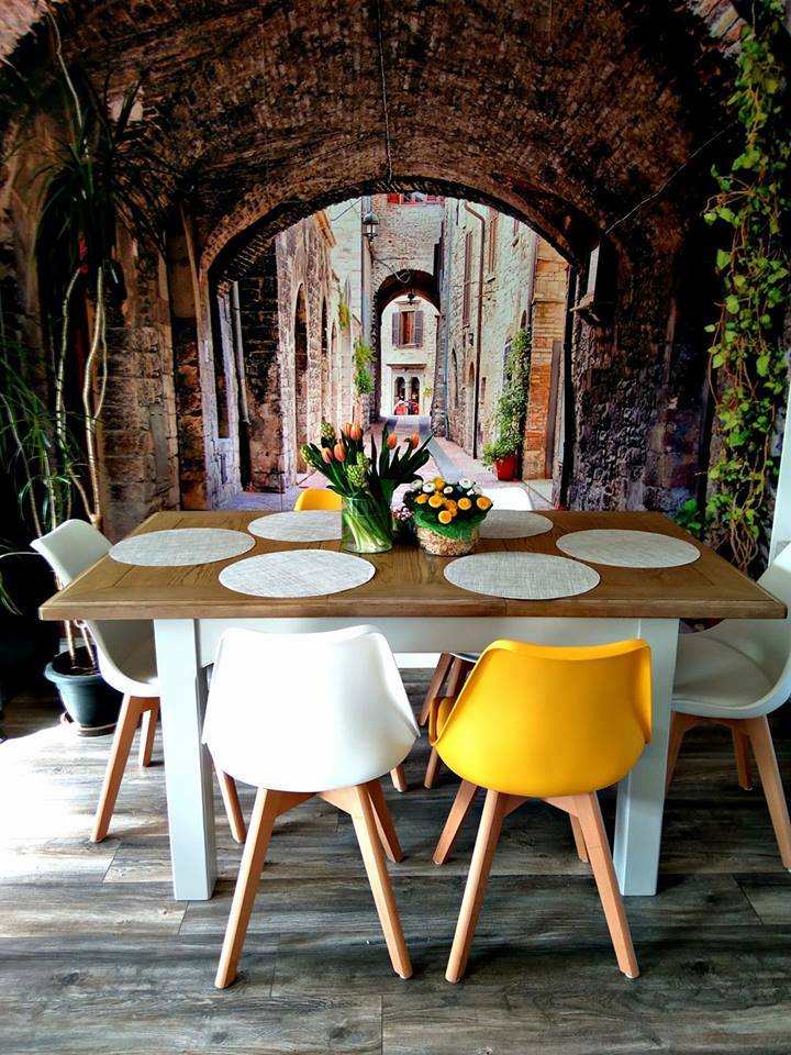 Tutaj kącik jadalniany w stylu bardziej sielskim, stolik na pierwszy rzut oka wygląda jakby stał na tej (włoskiej?) uliczce. Całość wygląda bardzo przytulnie i tak sobie myślę… a może by powiesić doniczkę z kwiatami gdzieś zaraz przy tych fototapetowych? Mielibyśmy efekt 3D ;))
