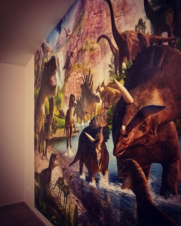 Na koniec zdradzę Wam jeszcze tajemnicę 😉 Jako dziecko marzyłam niesamowicie o ścianie w dinozaury, która niestety nigdy się nie pojawiła :/ (smutne, wiem ;)) Fototapeta z powyższego zdjęcia byłaby spełnieniem moich marzeń ;D Chociaż ta konkretna to pewnie wymarzona ściana jakiegoś chłopca z pasją do dinozaurów 🙂 Wyobraźmy sobie jeszcze jakieś wielkie doniczkowe rośliny na jej krańcach i mamy prawdziwy portal do Parku Jurajskiego 🙂 Super!