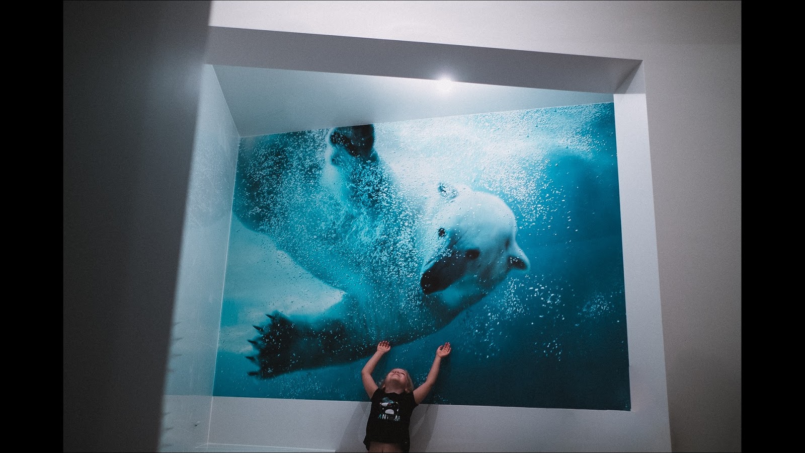 Mieliście może okazję być kiedyś we wrocławskim Afrykarium? Jest tam taki basen, w którym pływają hipopotamy, widzieć je pływające przy samej szybie to coś niesamowitego 🙂 Fototapeta z powyższego zdjęcia robi na mnie takie same wrażenie – jakby chłopiec stał przy szybie, za którą pływa niedźwiedź polarny. Efekt jest dodatkowo spotęgowany punktowym oświetleniem i  nieregularnymi ścianami dookoła fototapety (właściwie nawet ciężko stwierdzić gdzie dokładnie kończy się fototapeta, a zaczyna ściana!), tworzy to ciekawą ramę, trochę podobną do takiej w Afrykarium. Co tu dużo mówić, fantastyczny pomysł 🙂