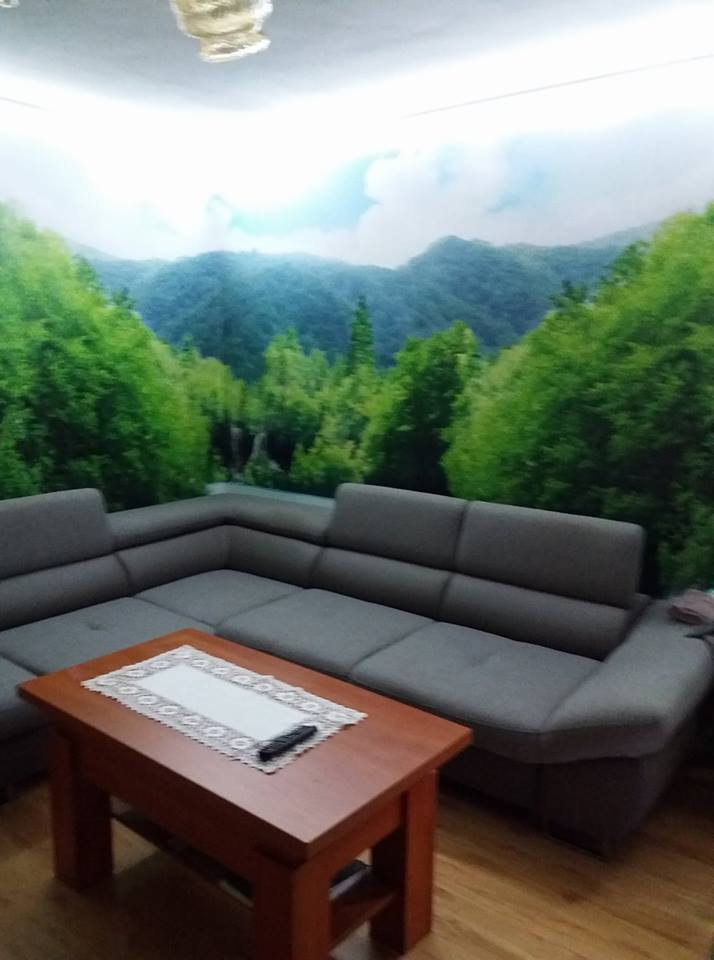 Ten salon wyróżnia się położeniem fototapety w rogu – przechodzi z jednej ściany na drugą i… tak, tak, powiększa wnętrze 😉 Fakt dodatkowego położenia jej w ten sposób sprawia jeszcze, że kąty pomieszczenia 'znikają’, a fototapeta nabiera głębi. Osobiście dorzuciłabym tu jeszcze zielone poduszki i jakiś wyjątkowy stolik – może zrobiony z ogromnego plastra drewna? 🙂