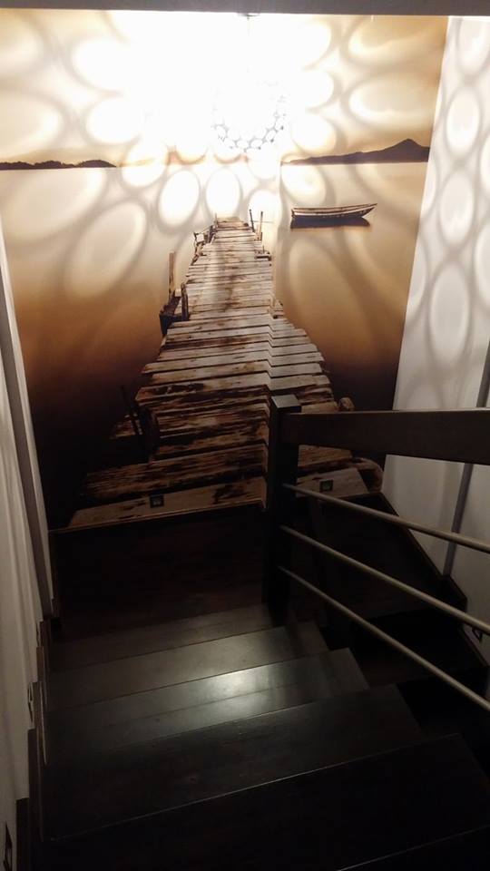 Fototapety bardzo często trafiają na korytarze, na powyższym zdjęciu znowu mam wrażenie jakbym ze schodów mogła zejść prosto na… pomost na jakiejś rajskiej wyspie 😉 Wszystko dzięki udanemu dopasowaniu koloru schodów i desek na pomoście, te drugie wyglądają jak przedłużenie tych pierwszych, mimo że kolory nie są identyczne. Bardzo fajny pomysł 🙂
