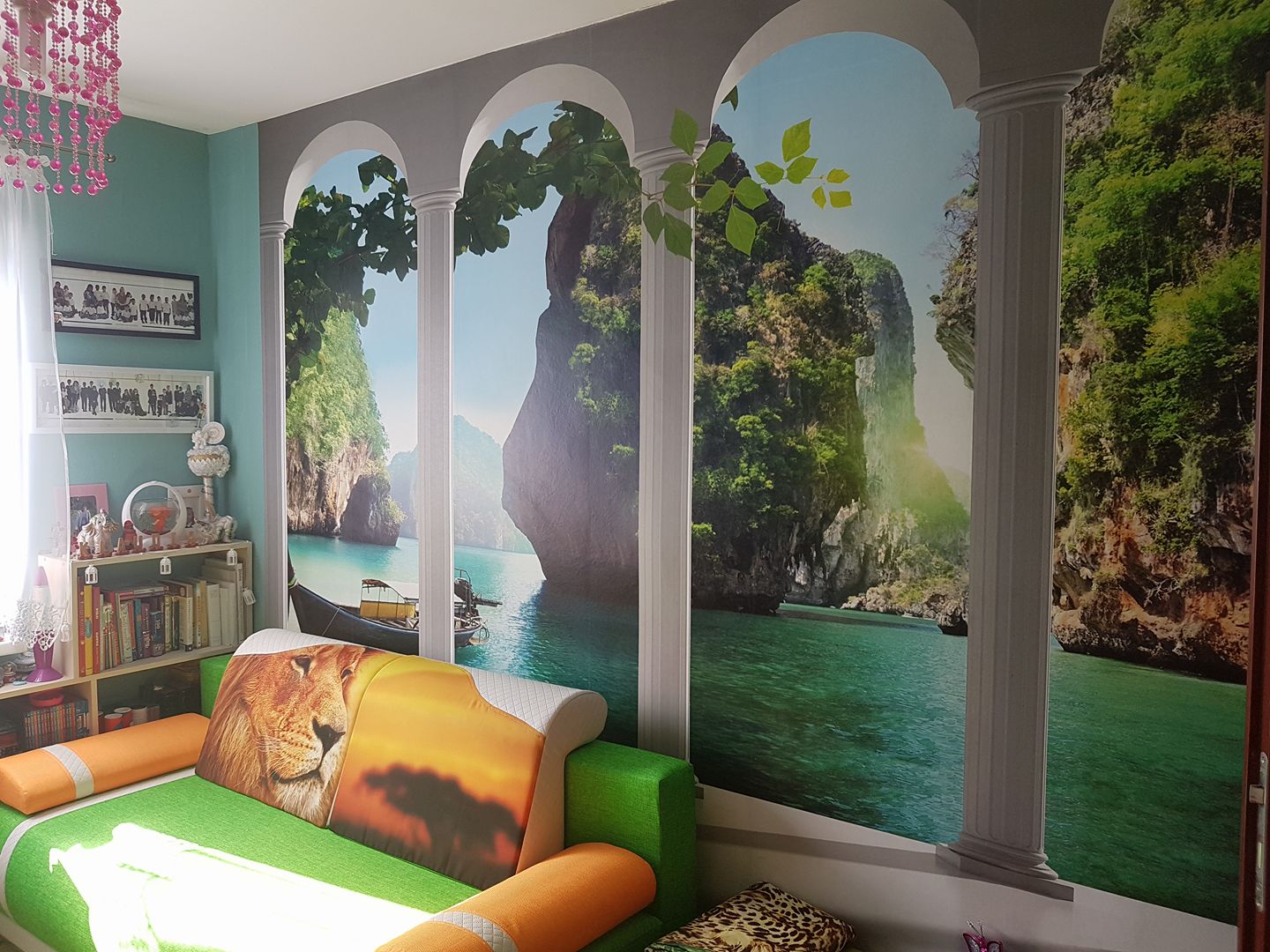 Na zdjęciu powyżej natomiast mamy wnętrze pełne energii, kolorów, taka pełnia lata 🙂 Przez fototapetę typu 'okno na świat’ (która również genialnie powiększa pomieszczenie) można poczuć się jak na wiecznych wakacjach 😀 Bardzo podoba mi się ta 'świeżość’. Gratuluję pomysłu 🙂