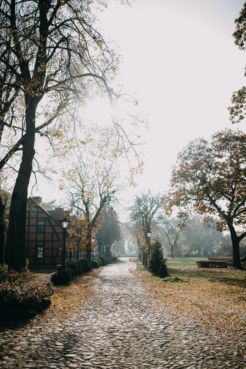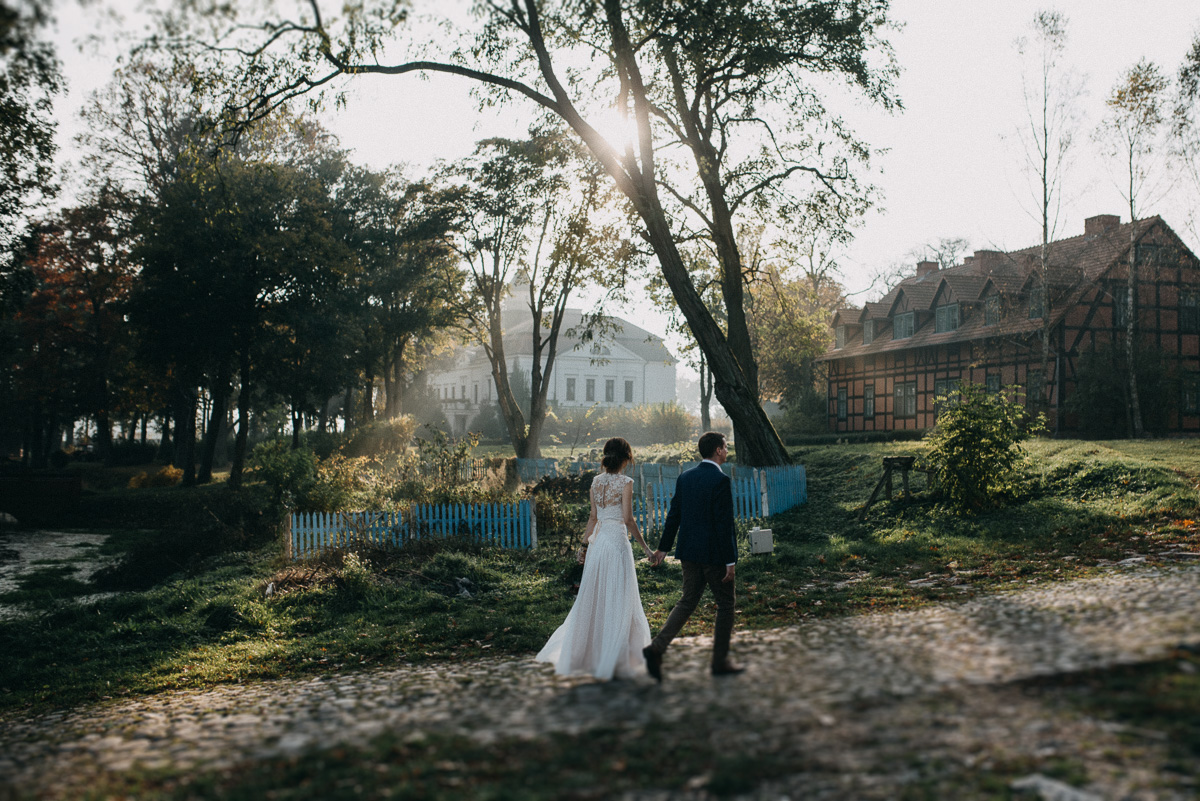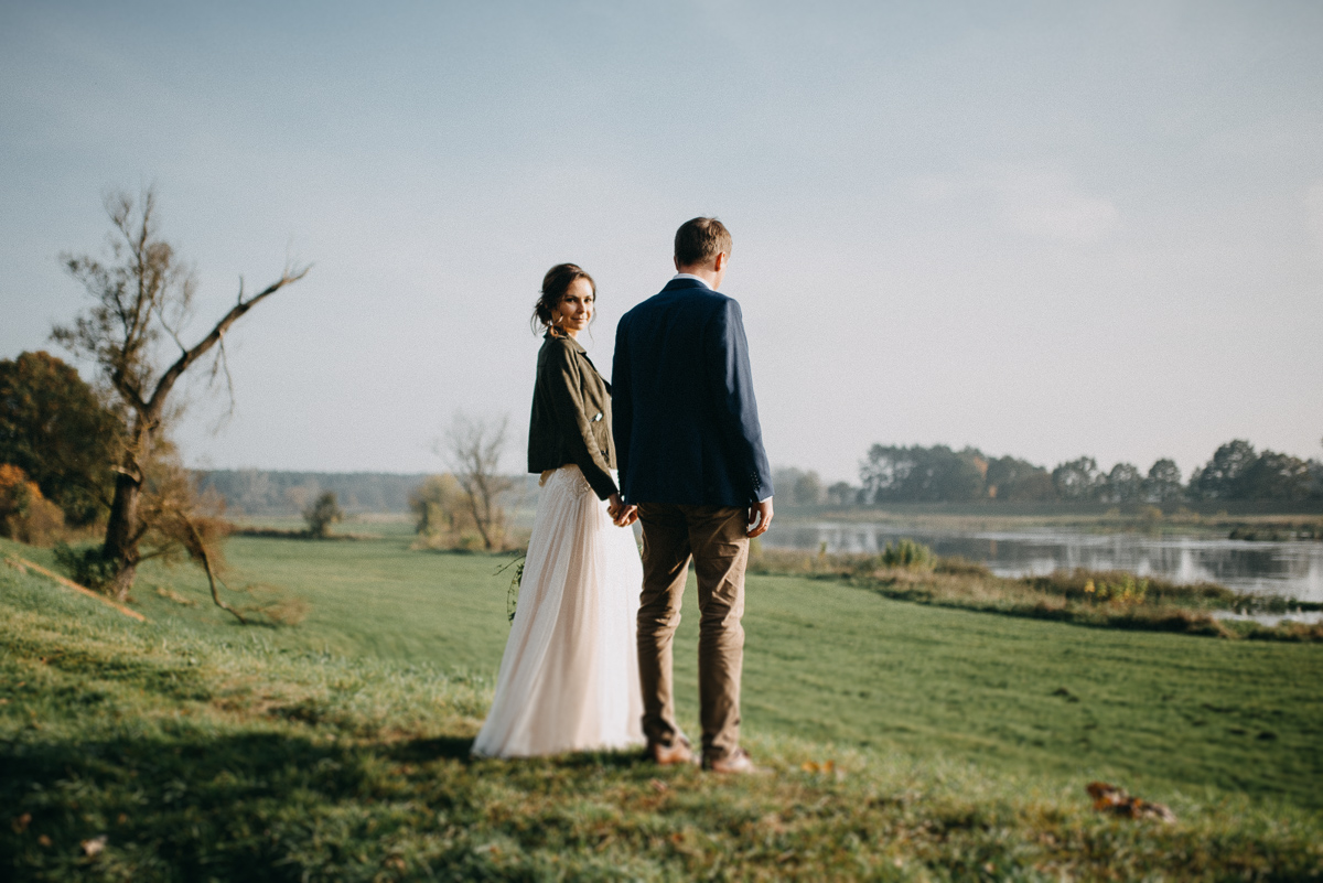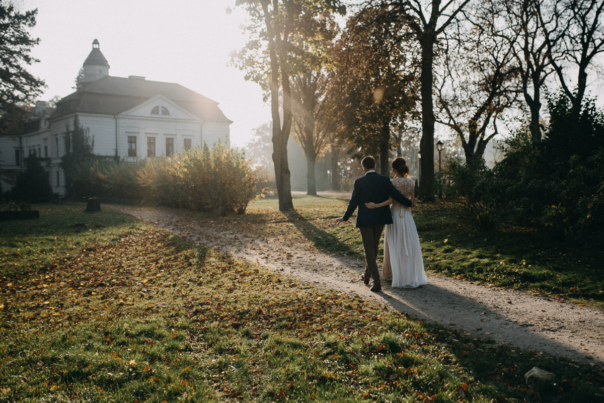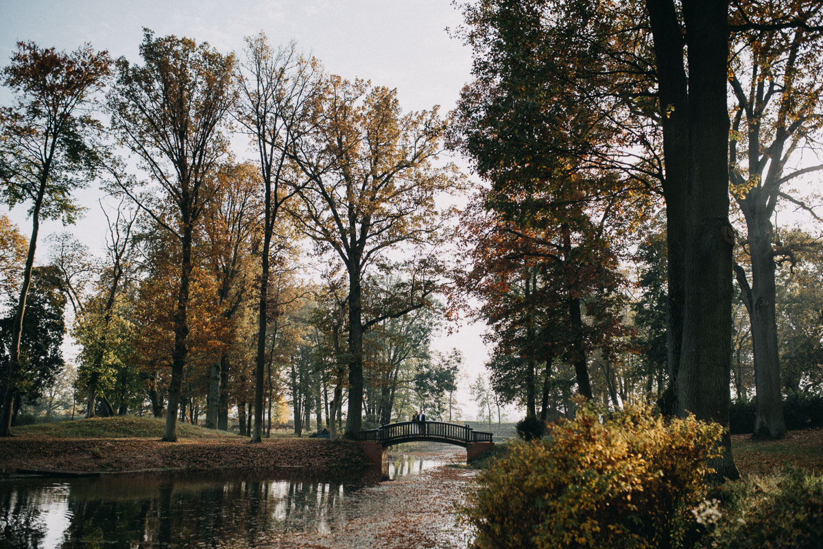 Z sesją trochę nam się zeszło, nie wiem czy pamiętacie, ale ślub był na początku sierpnia 😛 Jednak, jak to mówią, nie ma tego złego… Sesja jesienią naszym zdaniem ma dużo więcej uroku niż w pełni lata, wiecie, te wszystkie kolory dookoła… :)) No coś pięknego! Do tego szczęście sprzyjało i udało nam się też trafić na dobrą pogodę – w ciągu całego deszczowego tygodnia wybraliśmy dzień, który z zaskoczenia okazał się słoneczny (mimo, że aż do wyjazdu z domu na zewnątrz było pochmurno i bardzo mglisto).  Plener robił nam inny fotograf niż na ślubie, główną przyczyną był fakt, że nie do końca byliśmy zadowoleni ze zdjęć ślubnych – oczywiście jest wśród nich wiele, które bardzo lubimy, generalnie są też dobre technicznie, ale zabrakło nam w nich trochę więcej spontanicznych ujęć, fajnych detali i przede wszystkim ciekawych pomysłów, szkoda, że fotografka nie zaangażowała gości do jakichś fajnych zdjęć 😉