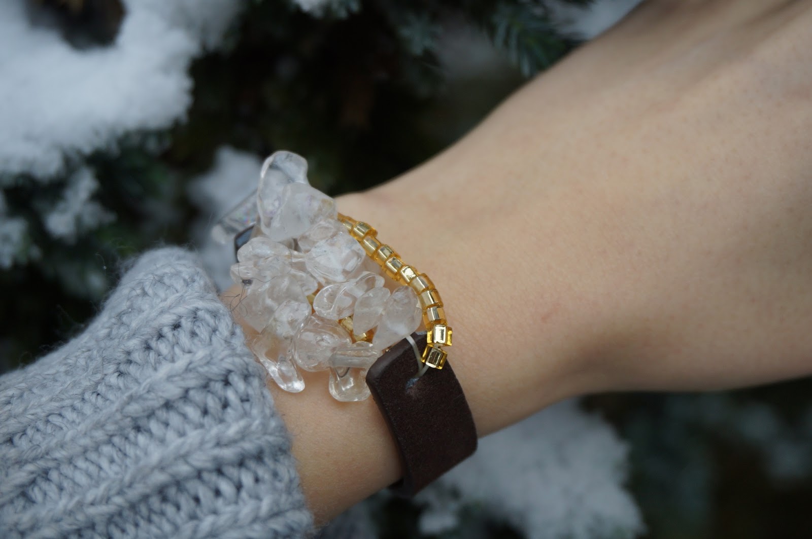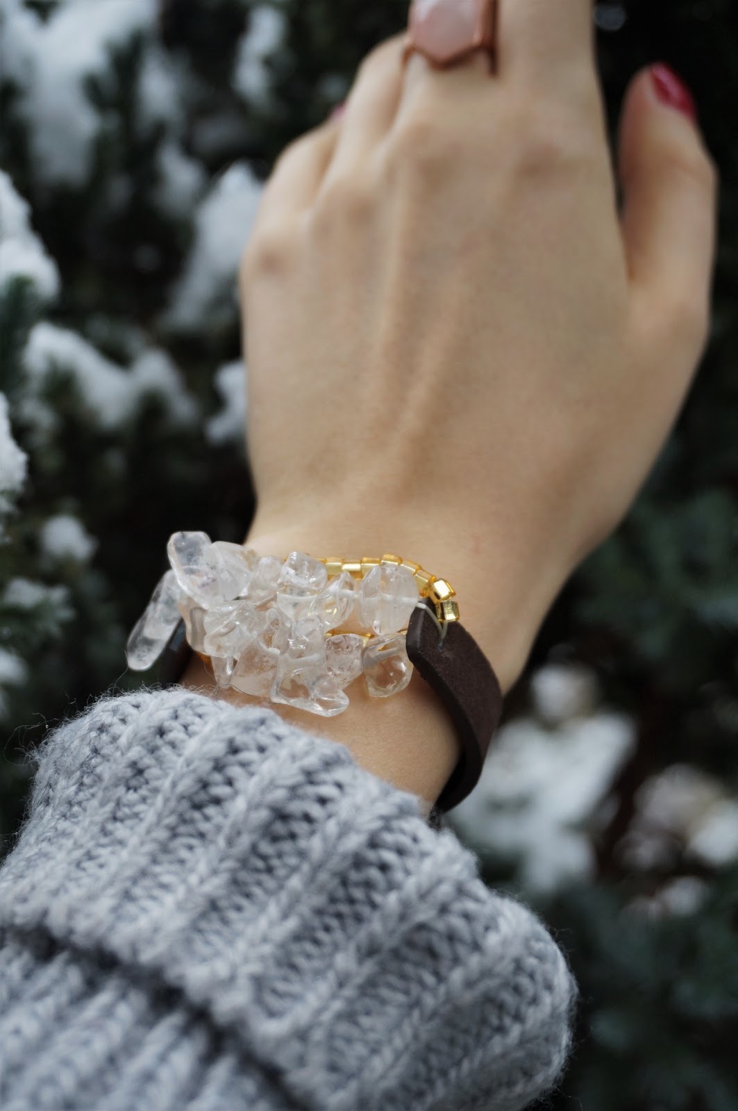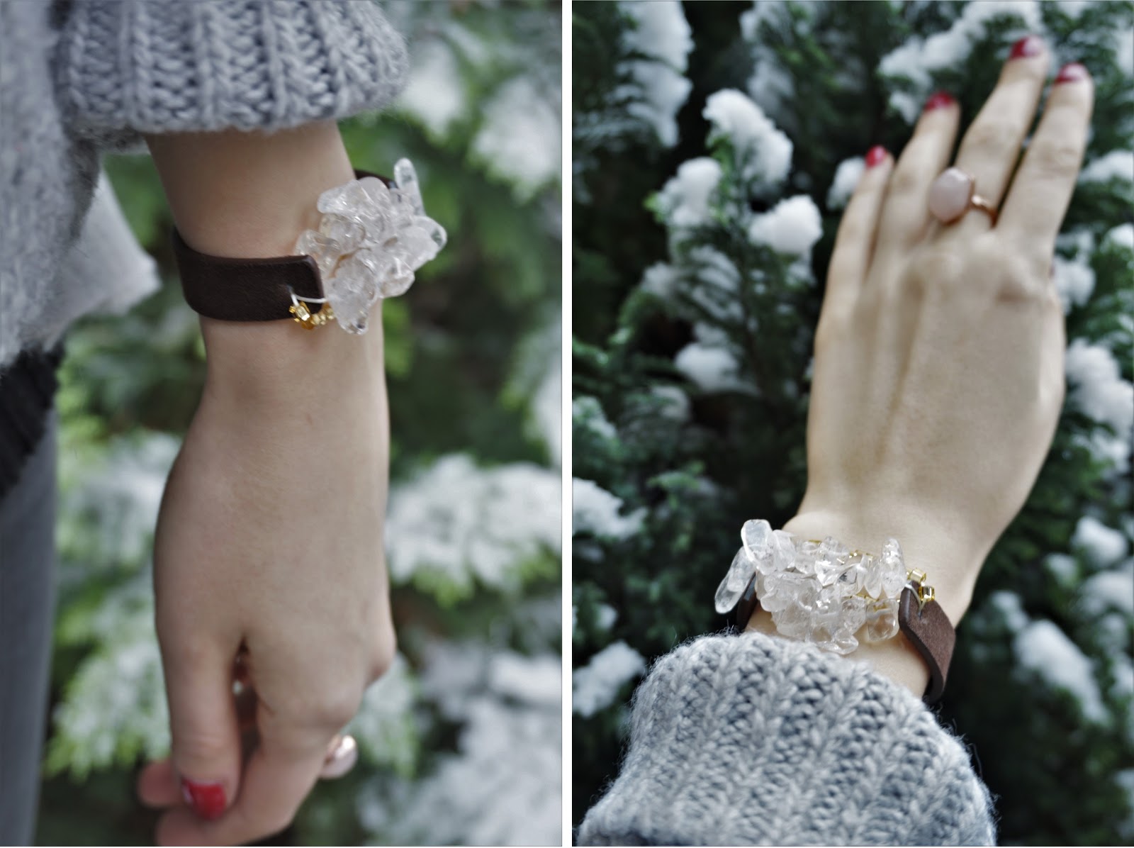 Bransoletka z kryształami i skórzanym paskiem nadaje się, moim zdaniem, i na lato i do grubych, zimowych swetrów 🙂