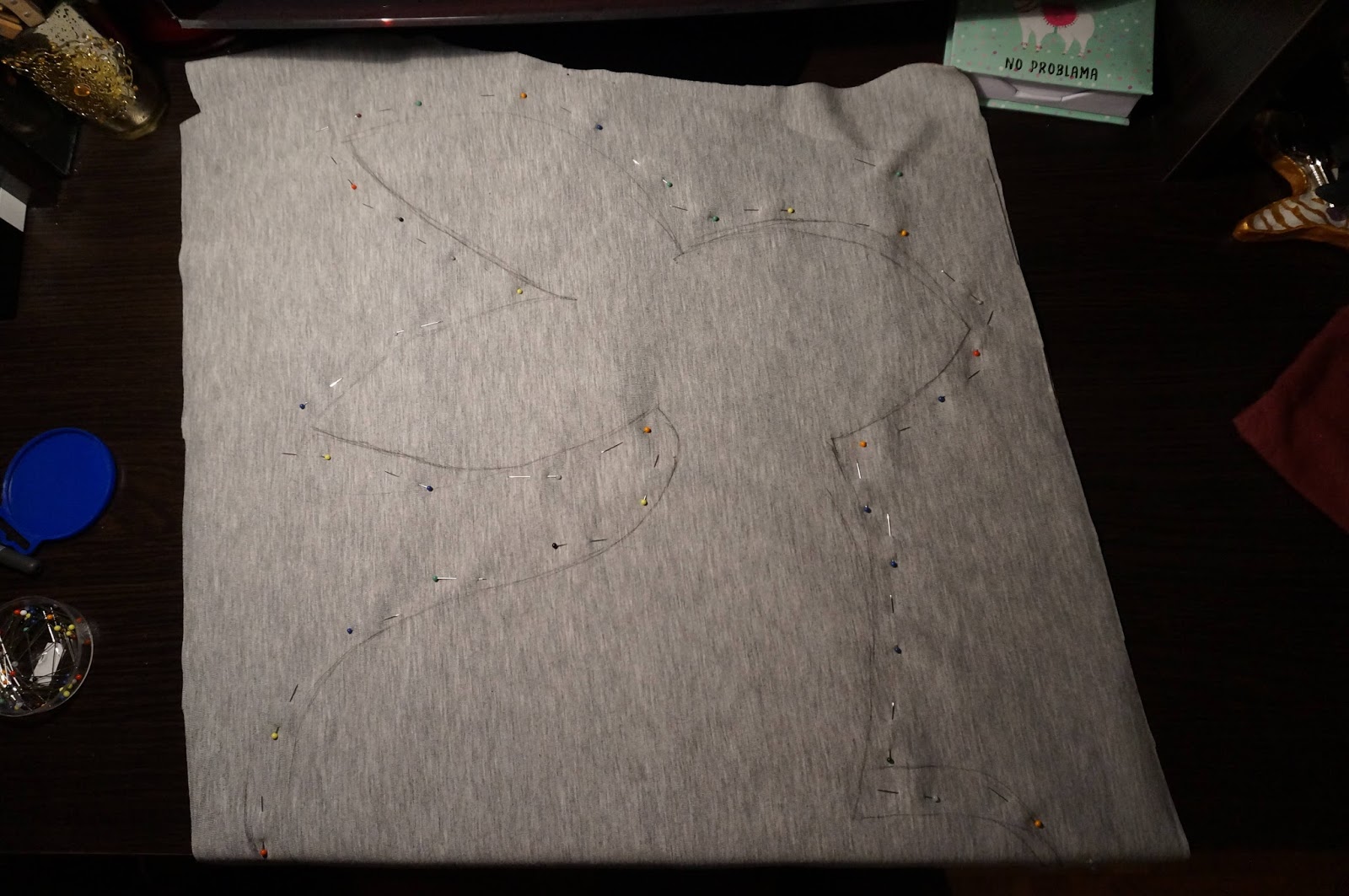 Następnie porządnie zabezpieczamy obrys szpilkami i można zacząć szyć – pamiętaj tylko o zostawieniu 10cm otworu na dole królika, żeby móc go wypchać. I dwa razy upewnij się, że dobrze złożyłaś materiał!:P (na zdjęciu poniżej to właśnie ta moja nieszczęsna pomyłka ;))