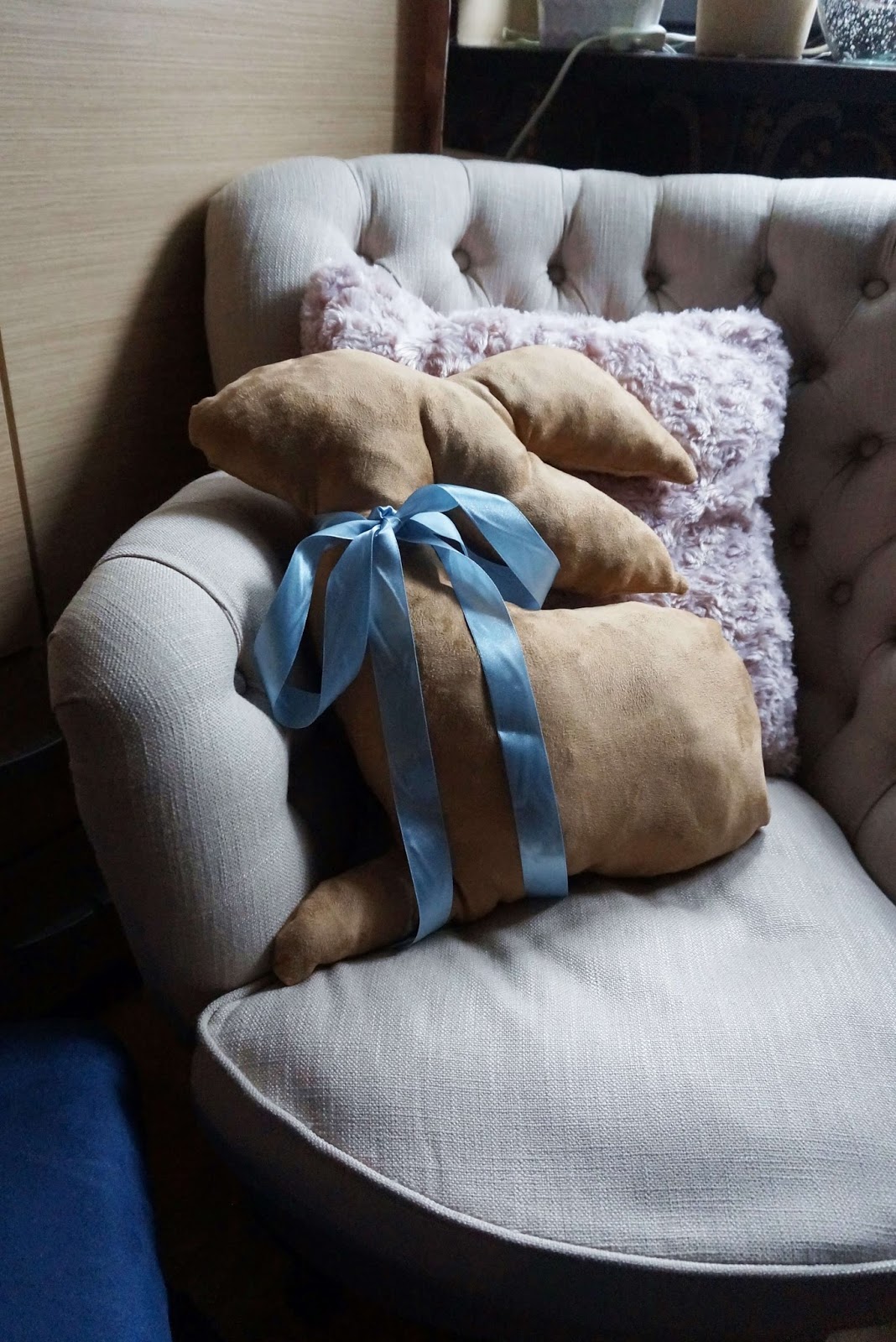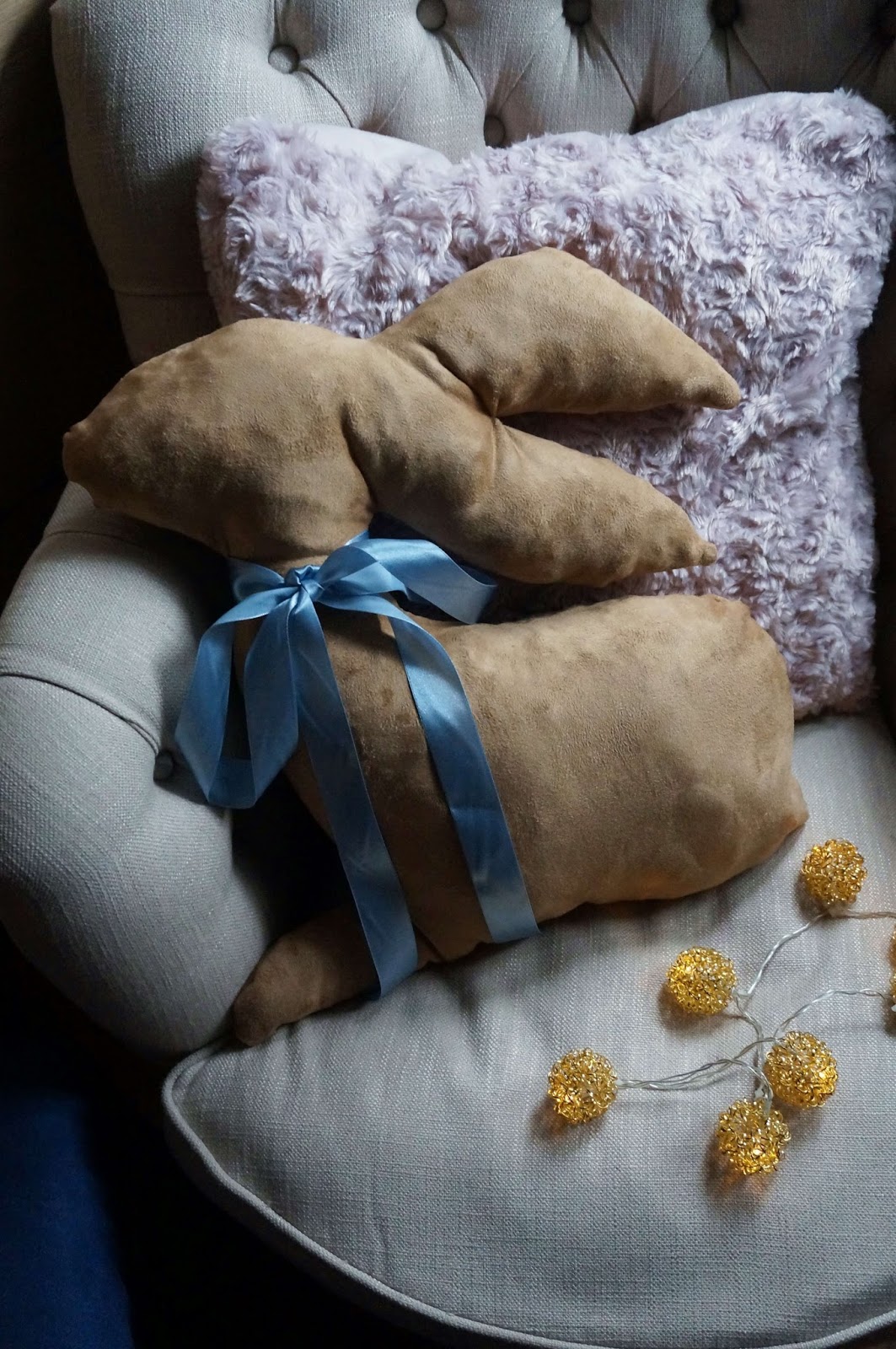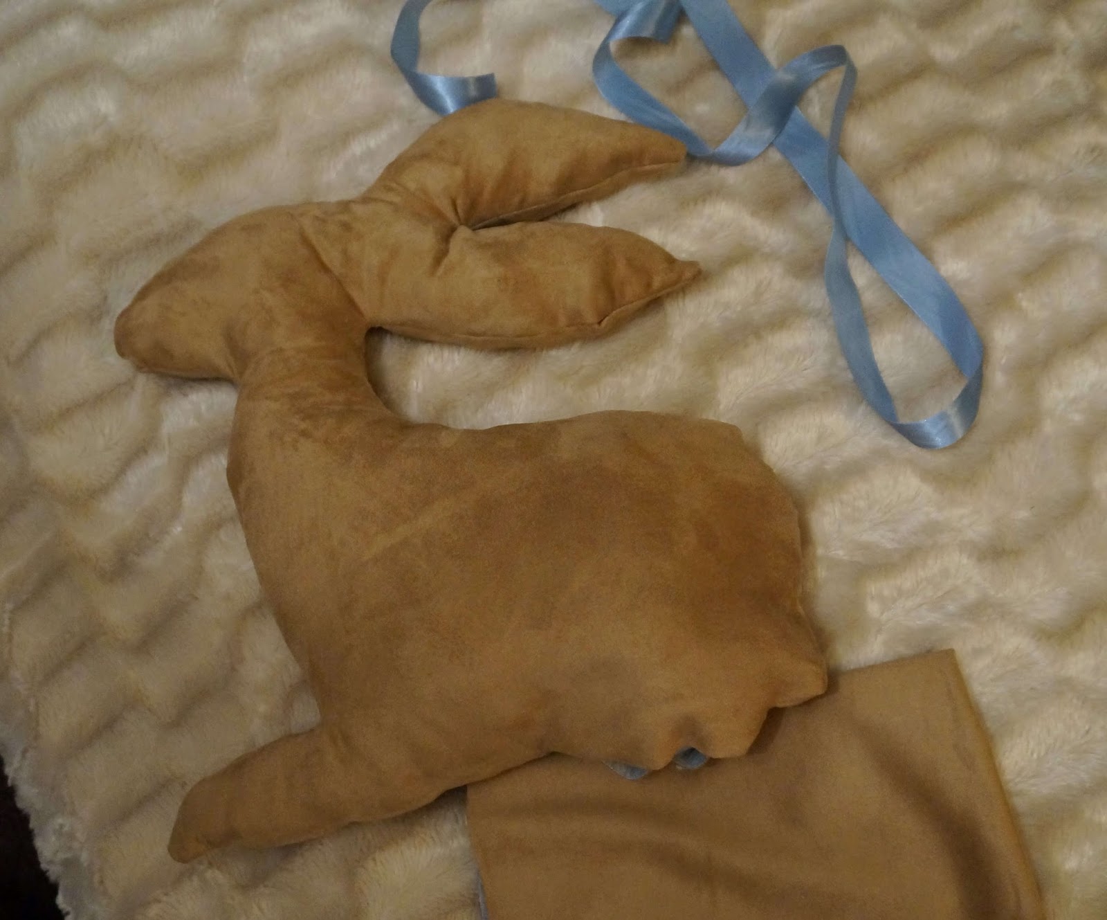 Tutaj już obszyty dookoła królik, wypchałam go wypełnieniem do poduszek, które miałam na strychu od innego 'projekciku’ 🙂 Otwór na dole królika zaszyłam ręcznie. Później tylko wstążka i gotowe!