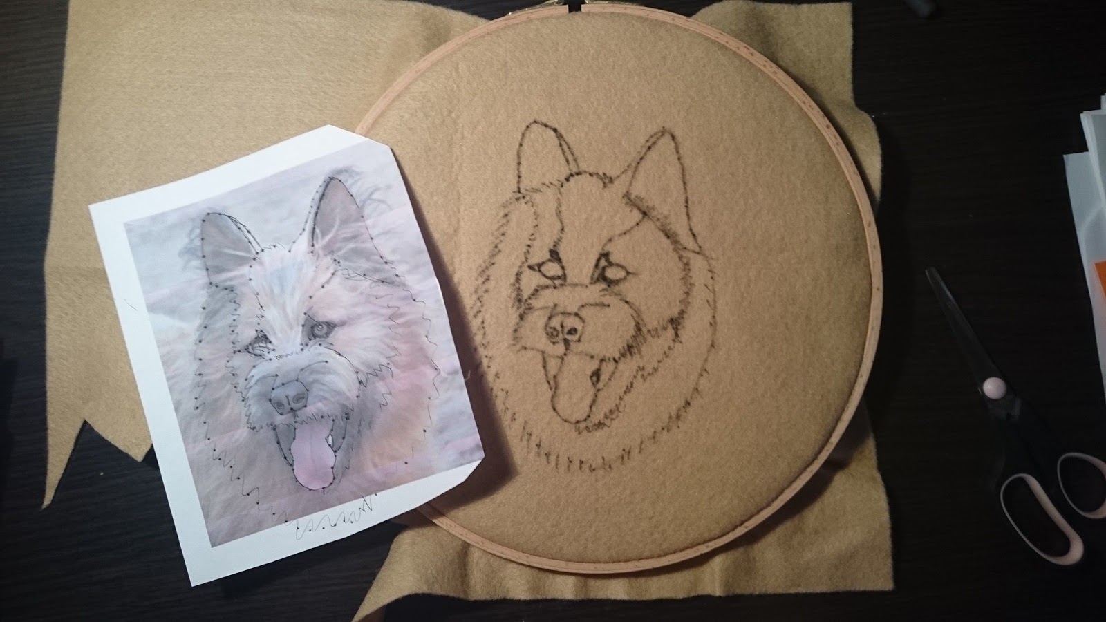 Najpierw obmyśliłam sobie plan działania – znalazłam zdjęcie, które najbardziej mi odpowiadało, wydrukowałam w wielkości pasującej do tamborka i zaznaczyłam na nim pisakiem najważniejsze „płaszczyzny” 🙂 Później przerysowałam to na wybrany arkusz filcu i wzięłam się do roboty. Swoją drogą nadal zastanawiam się czy nie lepiej było wybrać tło w jakimś kontrastowym kolorze – błękitny czy zielony…