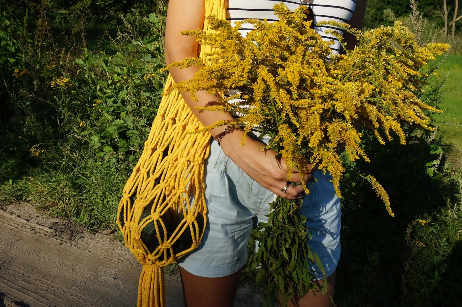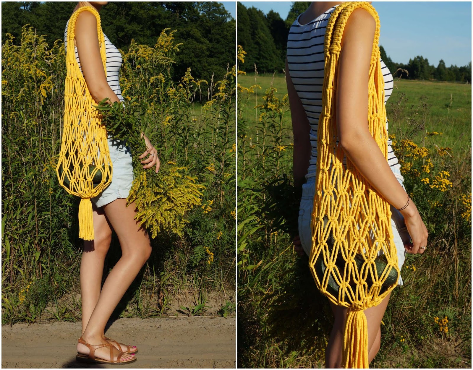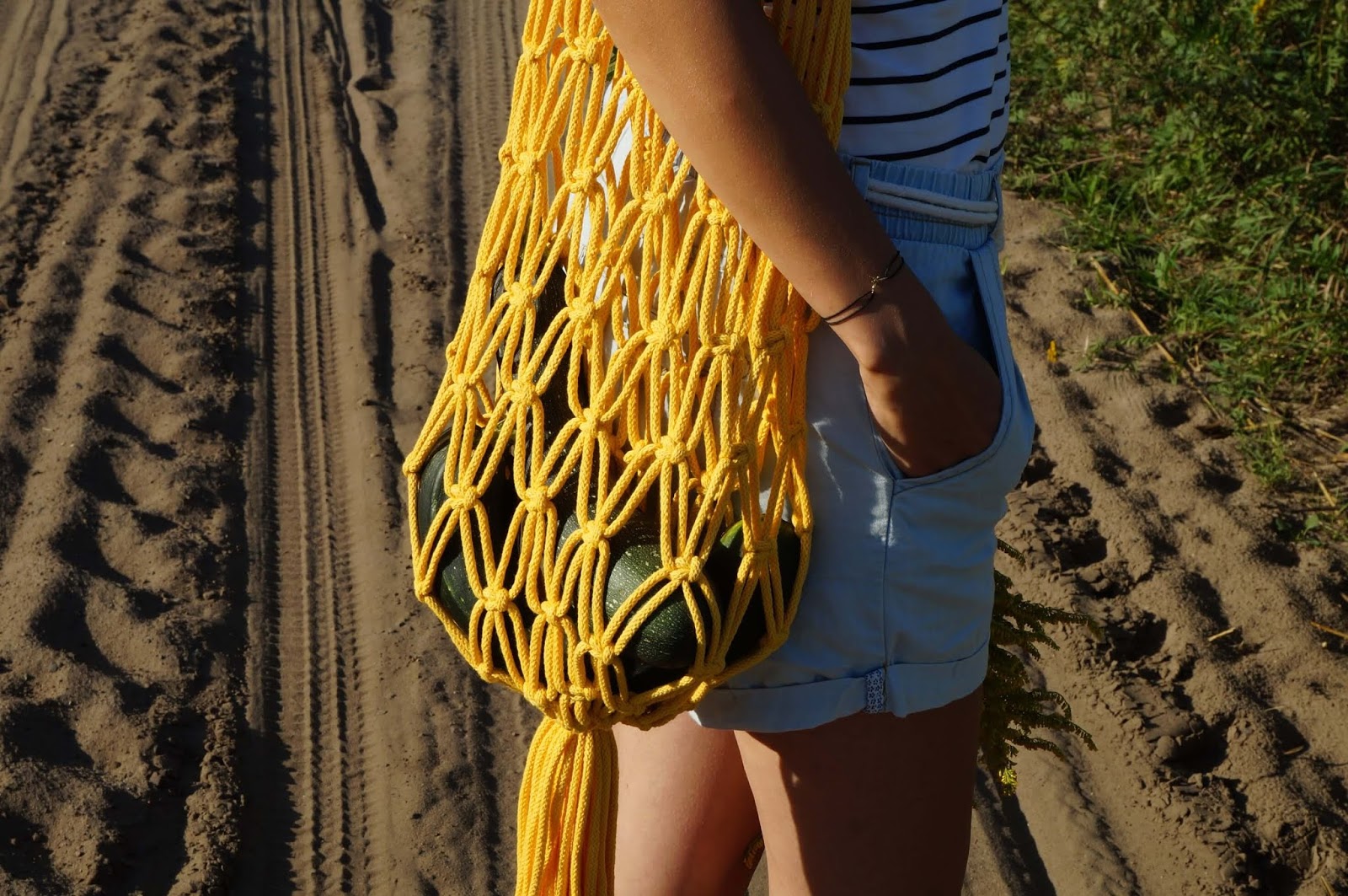 Wychodziłam z założenia, że to pewnie zbyt trudne, żeby nauczyć się czegoś wyłącznie patrząc na sploty i zdjęcia co jak zaplątać i myślałam raczej o jakimś kursie. Traf jednak chciał, że trafiłam na fb na darmowy kurs makramy trwający miesiąc, gdzie wszystko jest pokazywane i tłumaczone krok po kroku na filmikach 🙂 Załapałam się dosłownie na ostatnią chwilę! 😀 Kupiłam specjalny bawełniany sznurek, niecnie przywłaszczyłam kij od miotły i zaczęłam 😉 O dziwo nie jest to wcale takie trudne, więc w dwa popołudnia torba była gotowa 🙂 Jak widać na zdjęciach, wypróbowałam ją od razu nosząc cukinie od babci 😛 Zadziałała bardzo dobrze, myślę tylko czy nie uszyć jakiegoś prostego worka lnianego do środka, tak żebym mogła w niej nosić wszystko, nie tylko większe rzeczy 🙂