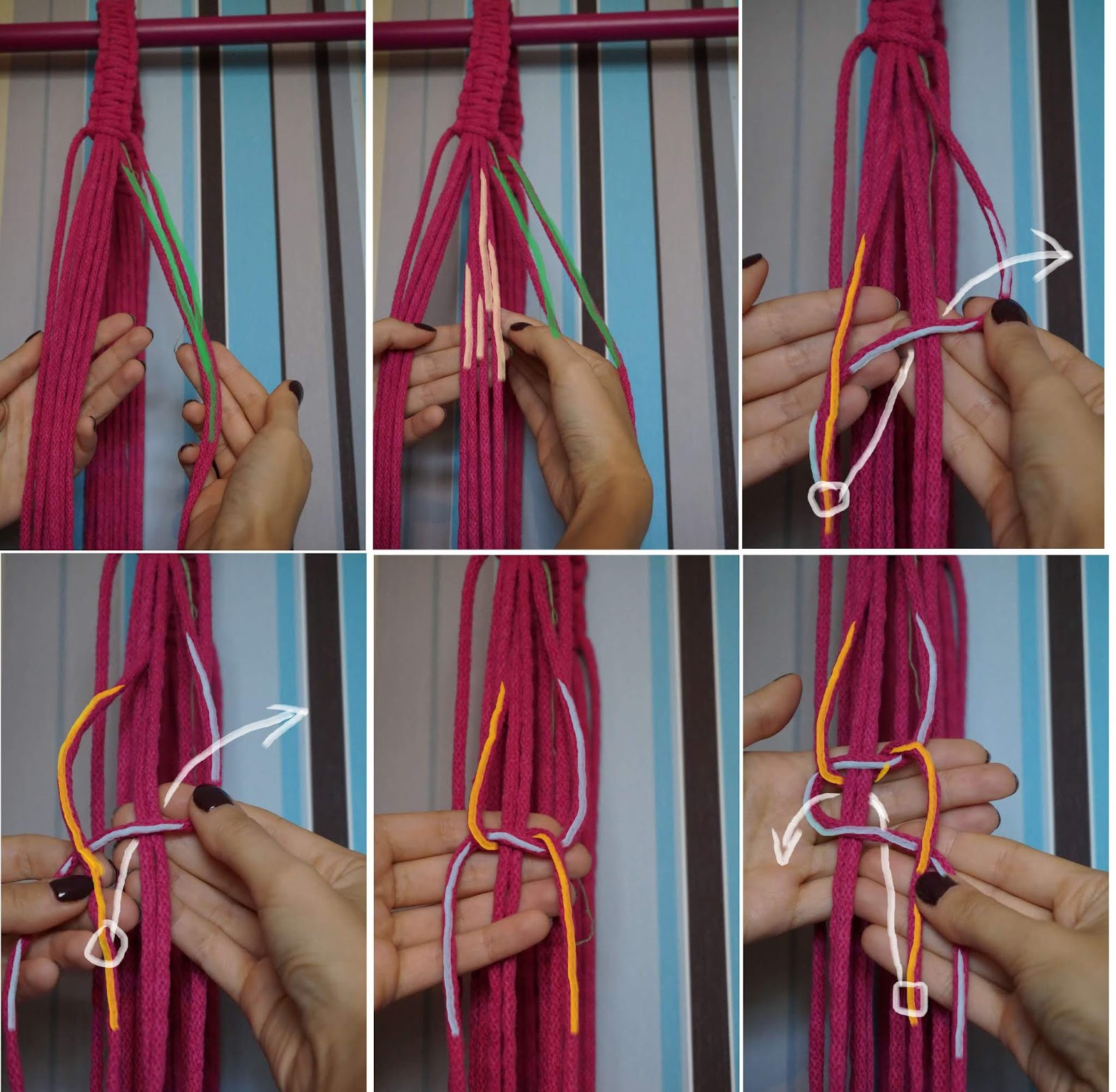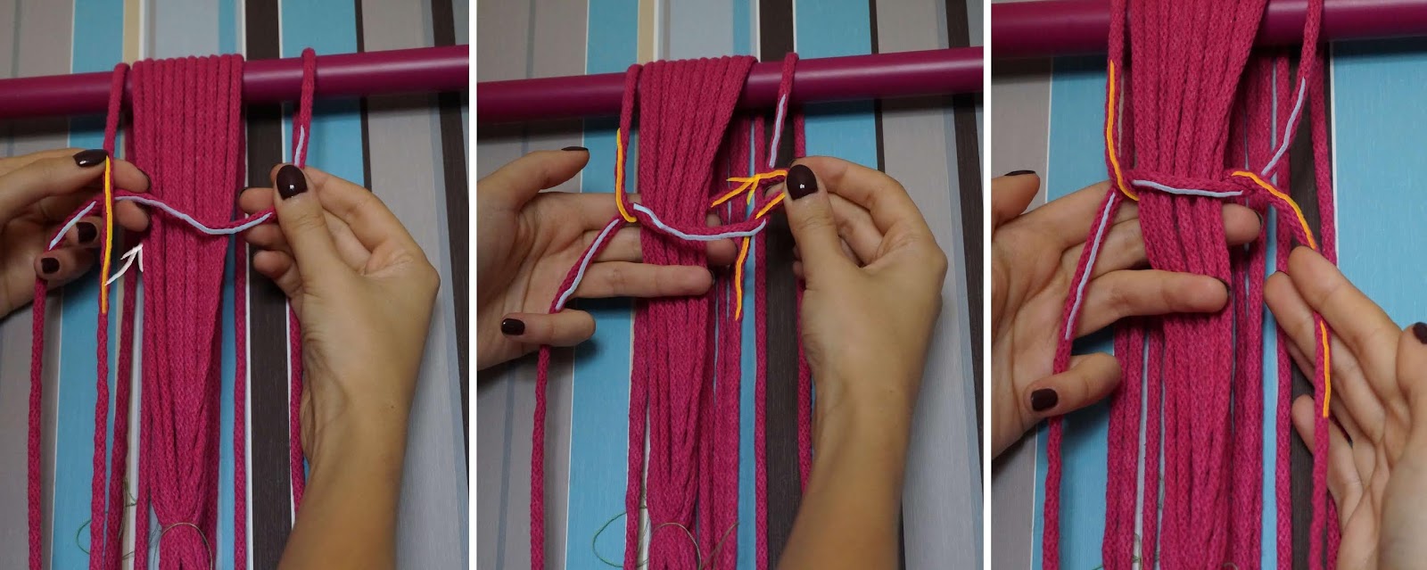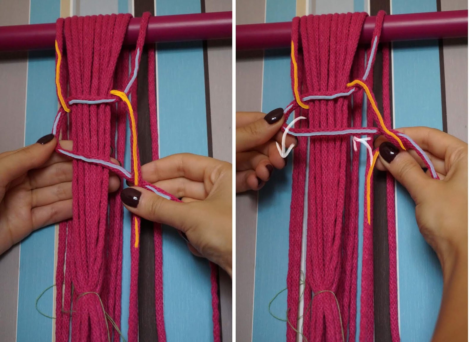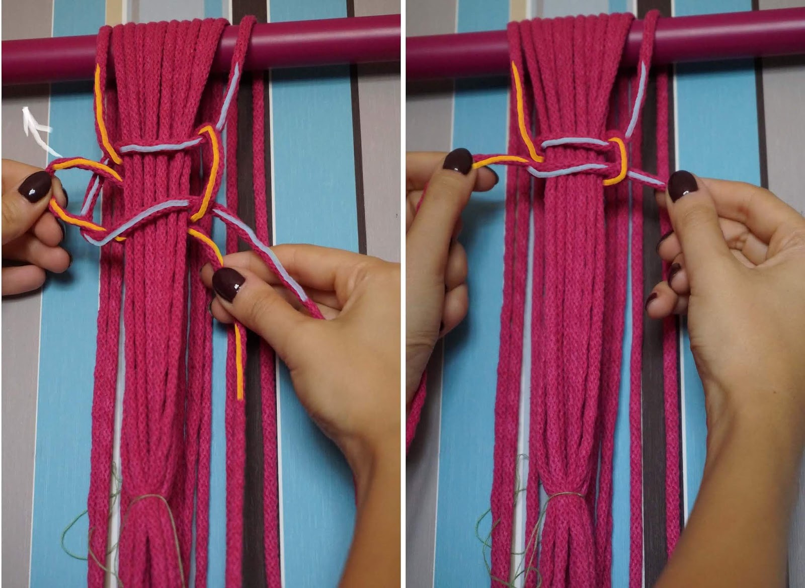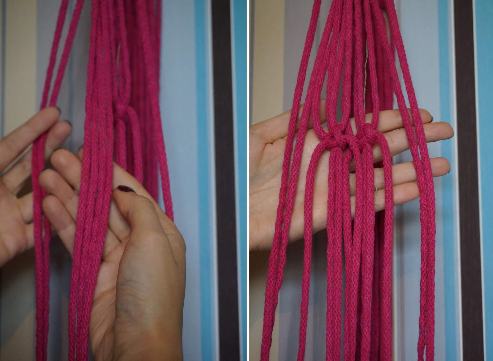 - Mając przy każdym końcu uchwytu po dwa węzły, należy teraz te uchwyty połączyć (zdjęcia powyżej). Weź dwa skrajne sznurki z jednego uchwytu i najbliższe dwa skrajne sznurki drugiego uchwytu – zapleć je znowu w węzeł płaski.