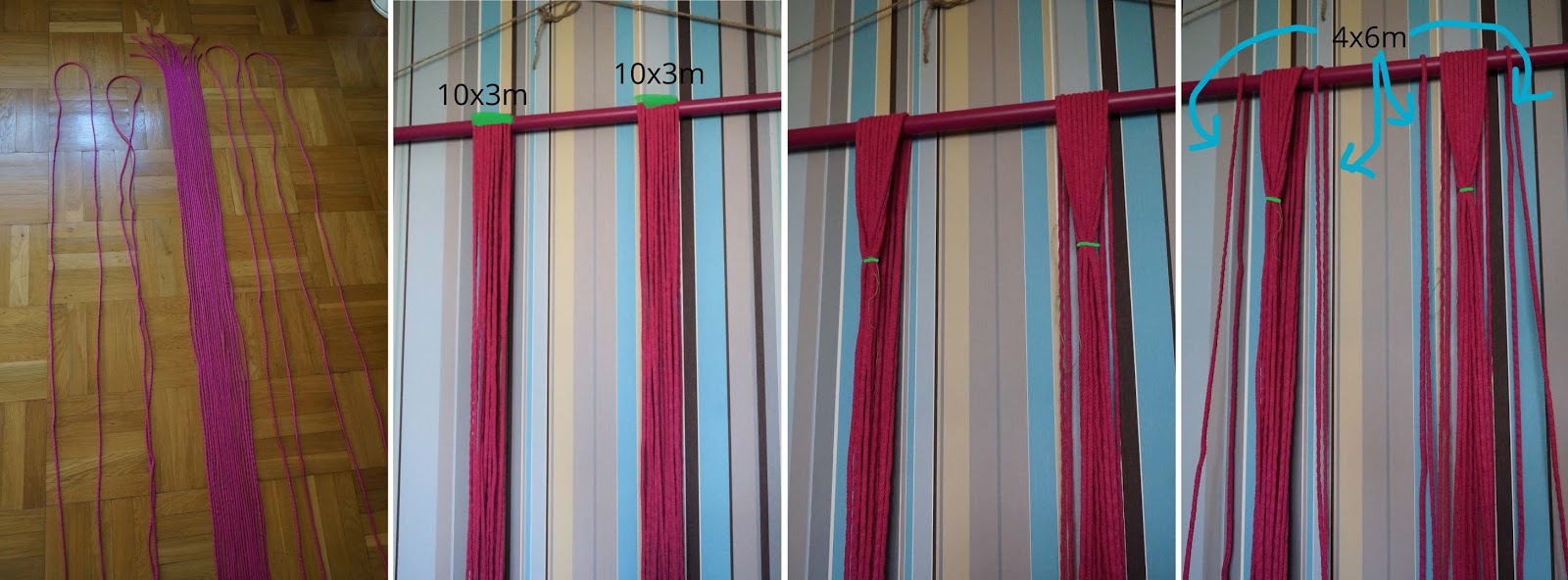 - Ze sznurka utnij 20 mniej więcej równych części długości ok.3m oraz 4 części długości ok.6m.