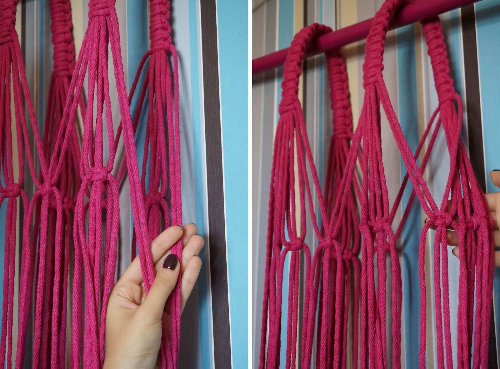 - Zsuń sznurki jakieś 15cm w dół tak jak na trzecim zdjęciu. Długość od zielonej nitki do stelaża to będzie połowa twojego uchwytu.