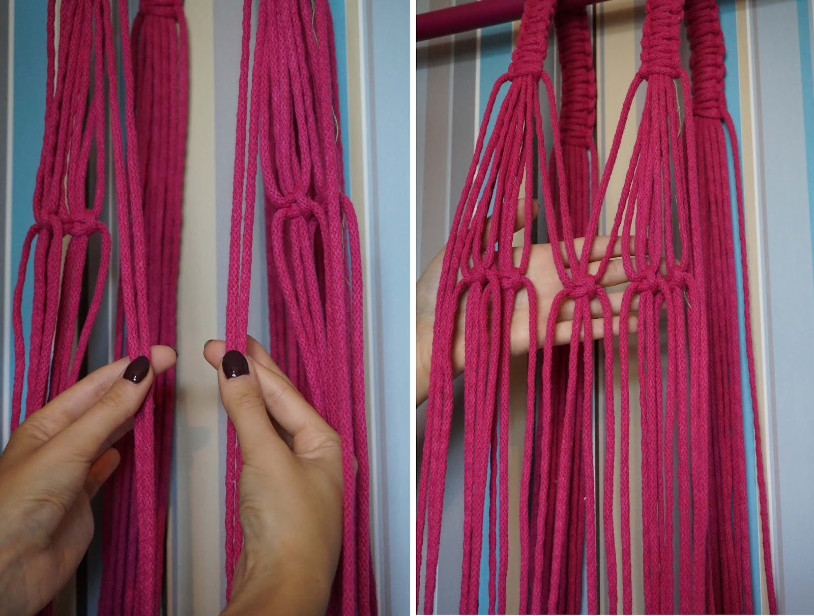 - Teraz pozostaje już zaplatanie torby w dół. Pamiętaj – zawsze bierz dwa sznurki wiszące z jednego węzła i dwa sznurki z drugiego węzła i łącz je w kolejny węzeł trochę niżej (zdj.powyżej). I tak twórz kolejne rządki węzłów, aż stwierdzisz, że torba jest wystarczająco długa.